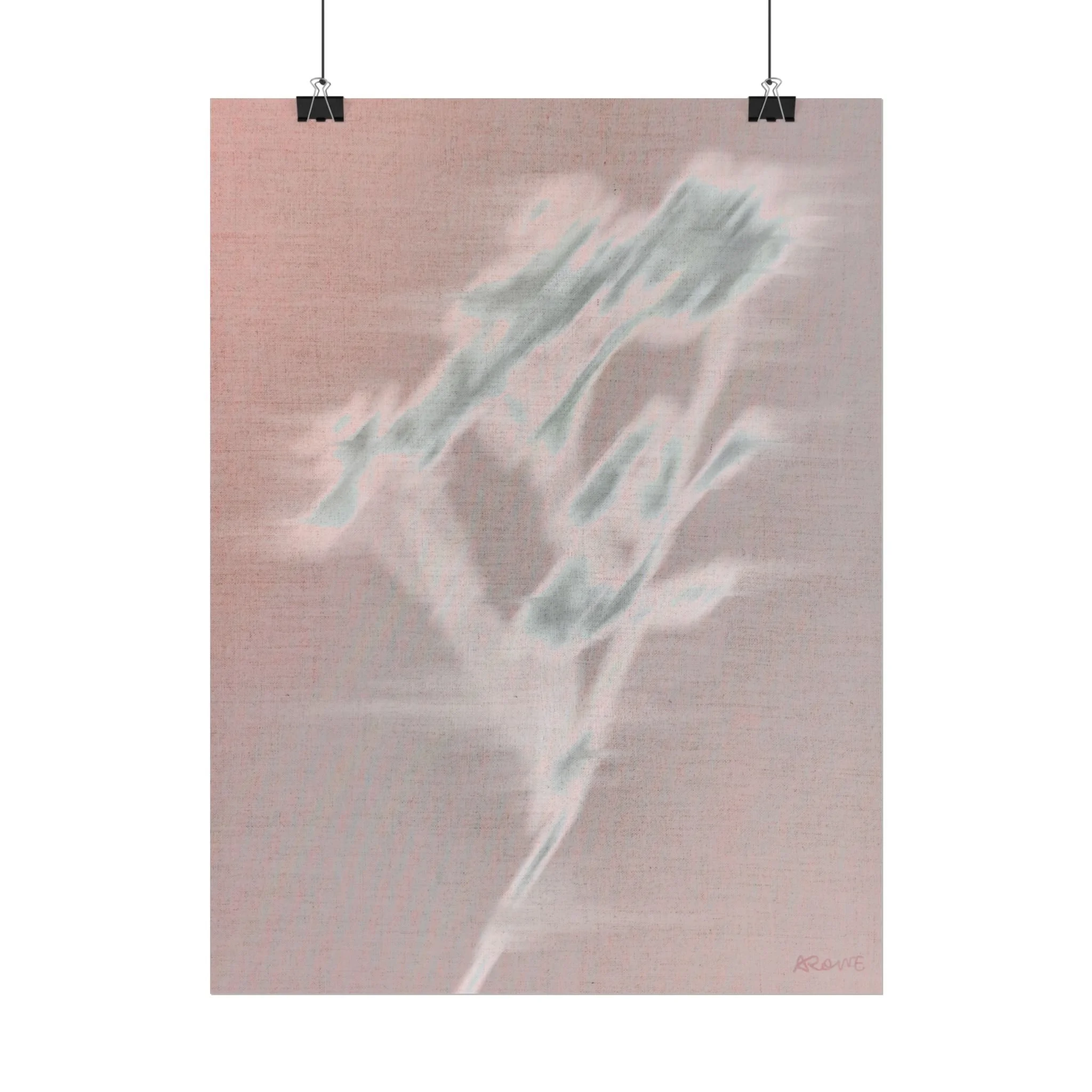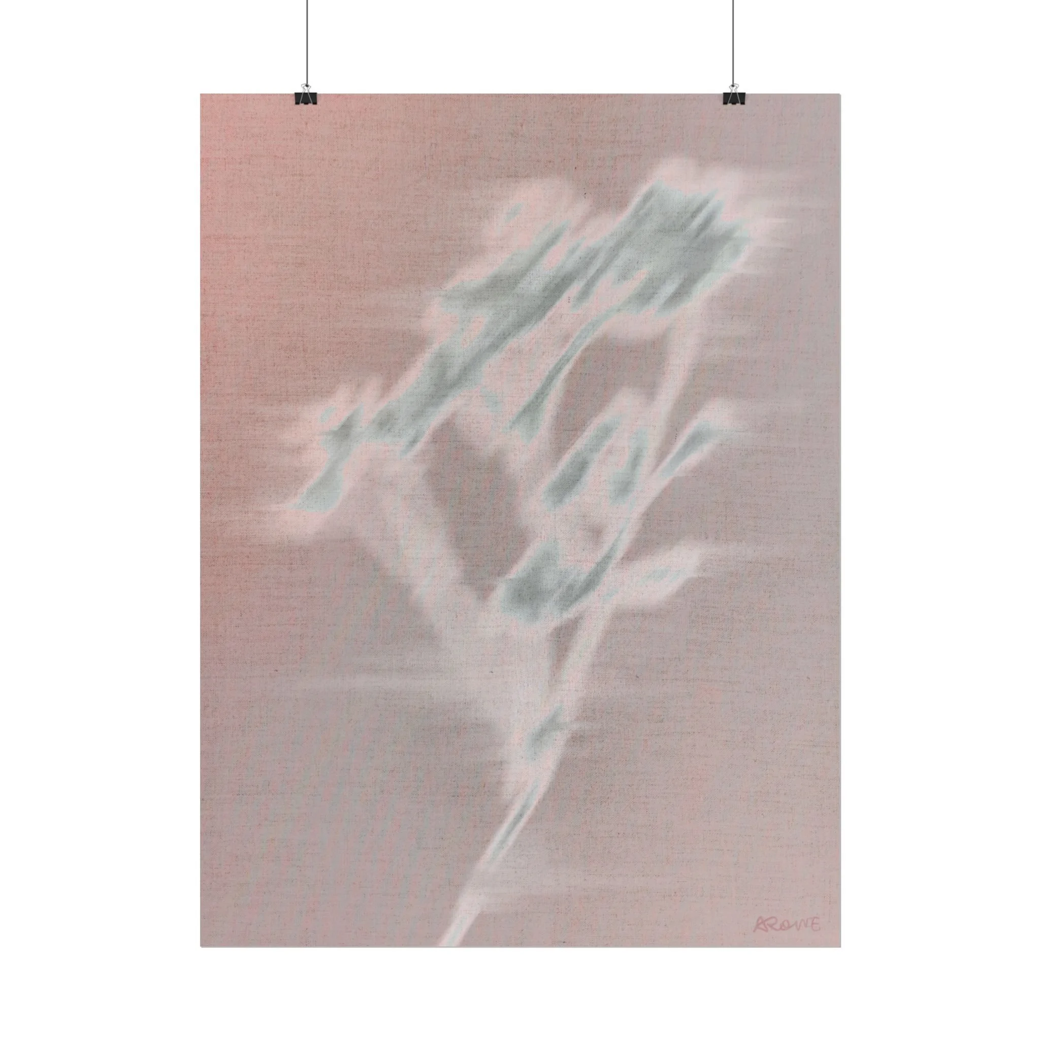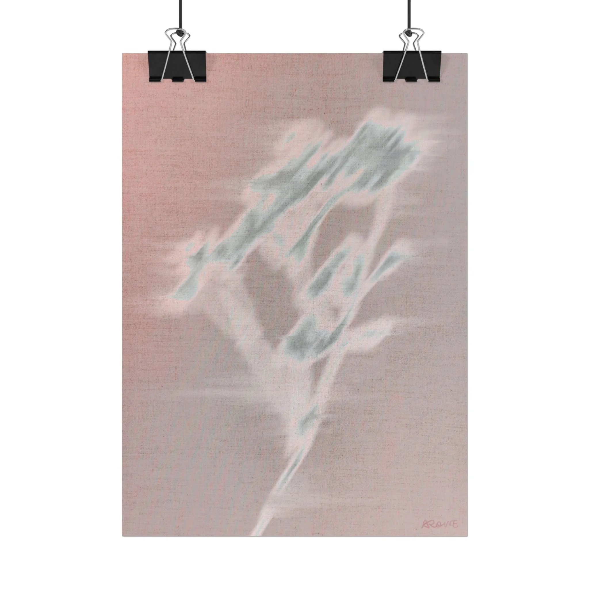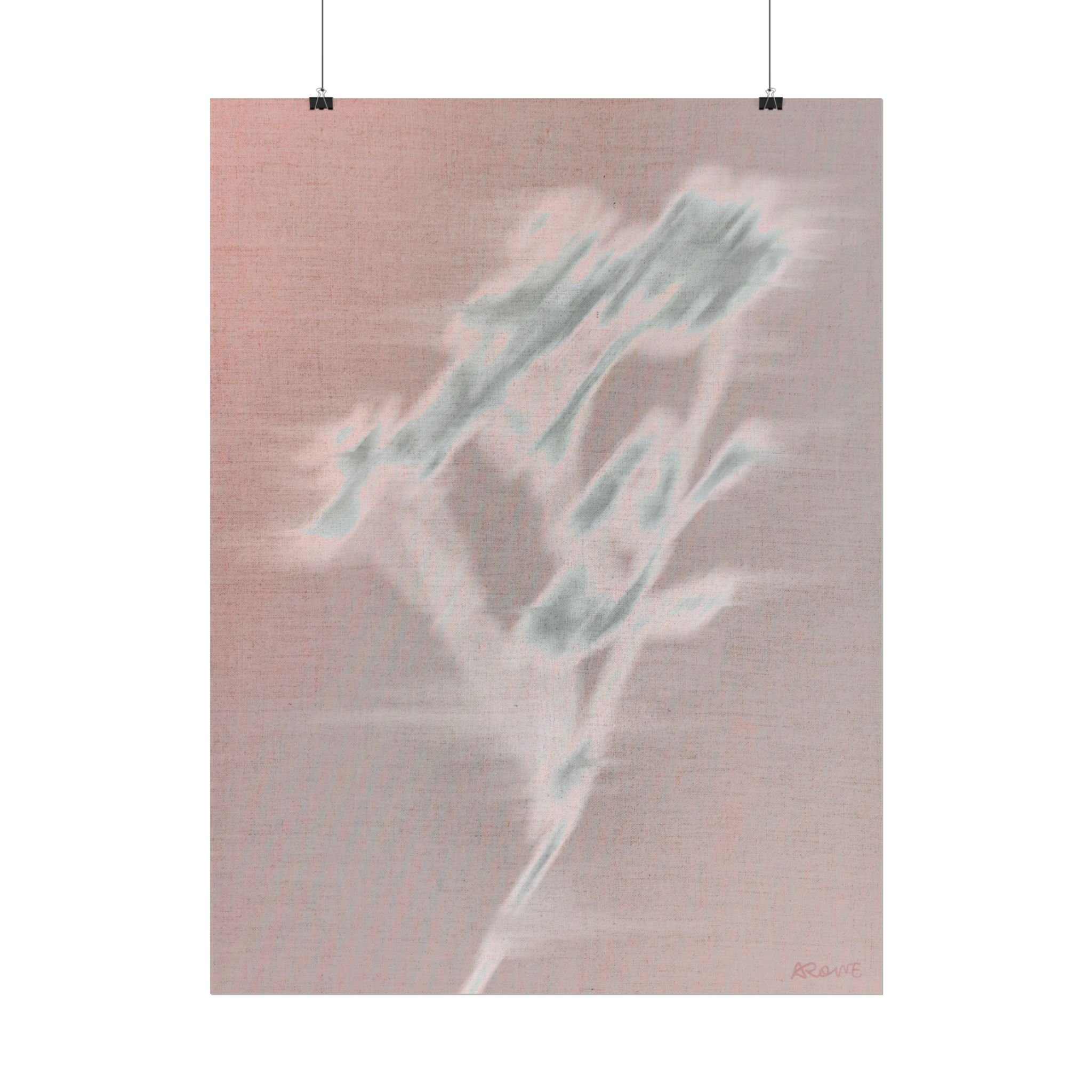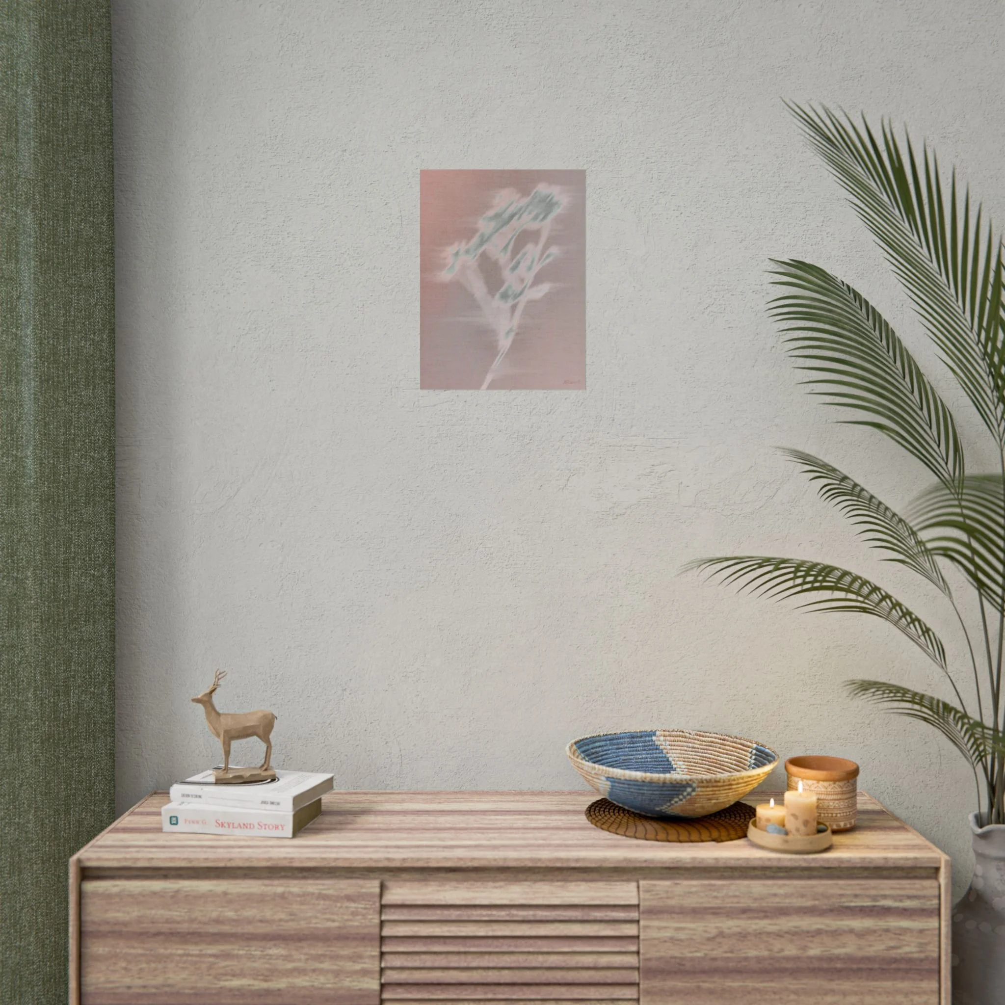 A softly muted botanical poster that feels like a memory caught on paper. Gentle pastel pinks and faded seafoam greens blend into a textured, watercolor-like field where a single floral silhouette drifts across the surface. The result is quiet and contemplative—an artwork that settles into a room without shouting, bringing a restful, vintage atmosphere to bedrooms, reading nooks, or cozy living spaces. Rolled for safe transit, this piece arrives ready to frame or mount and adds a whisper of nature and calm to everyday life.