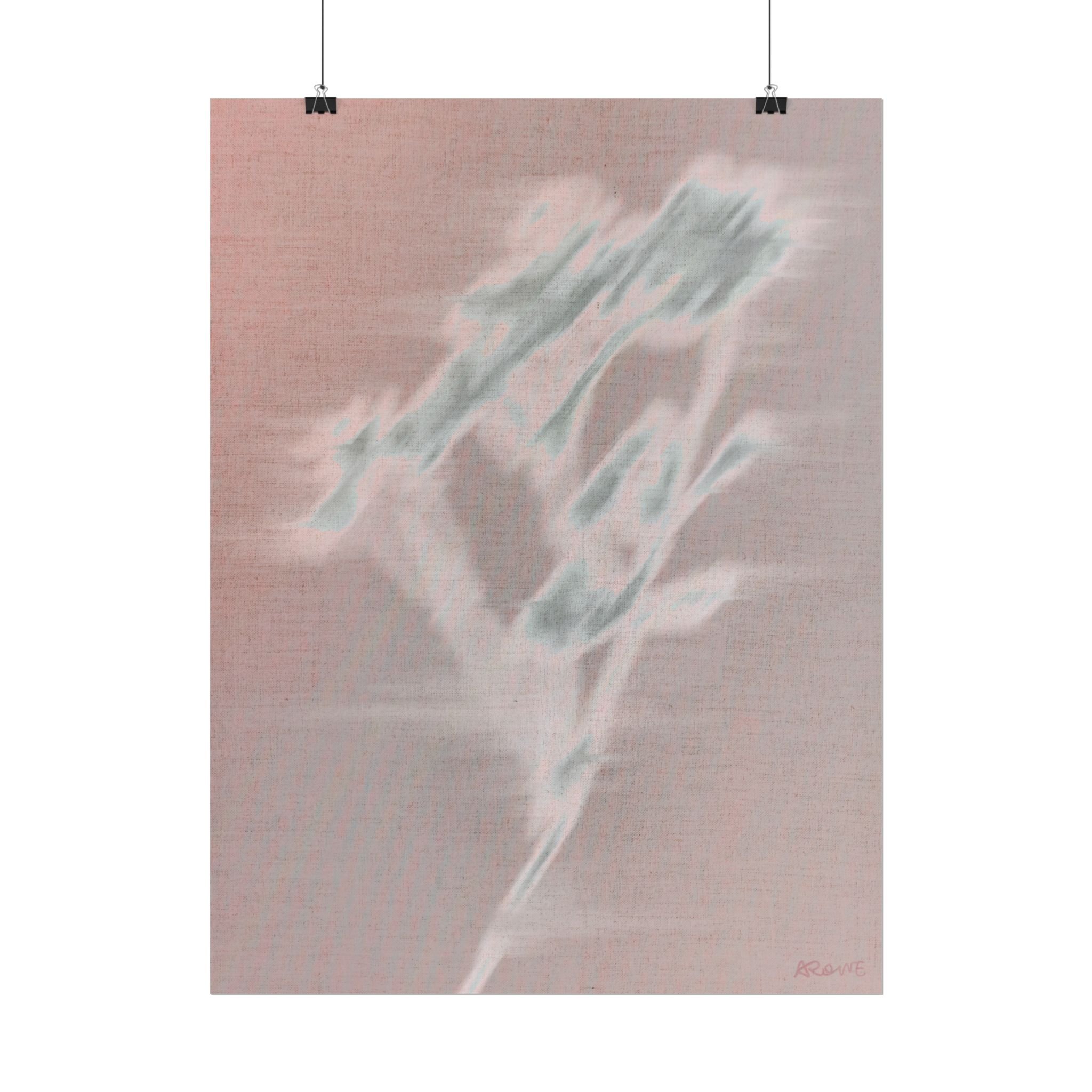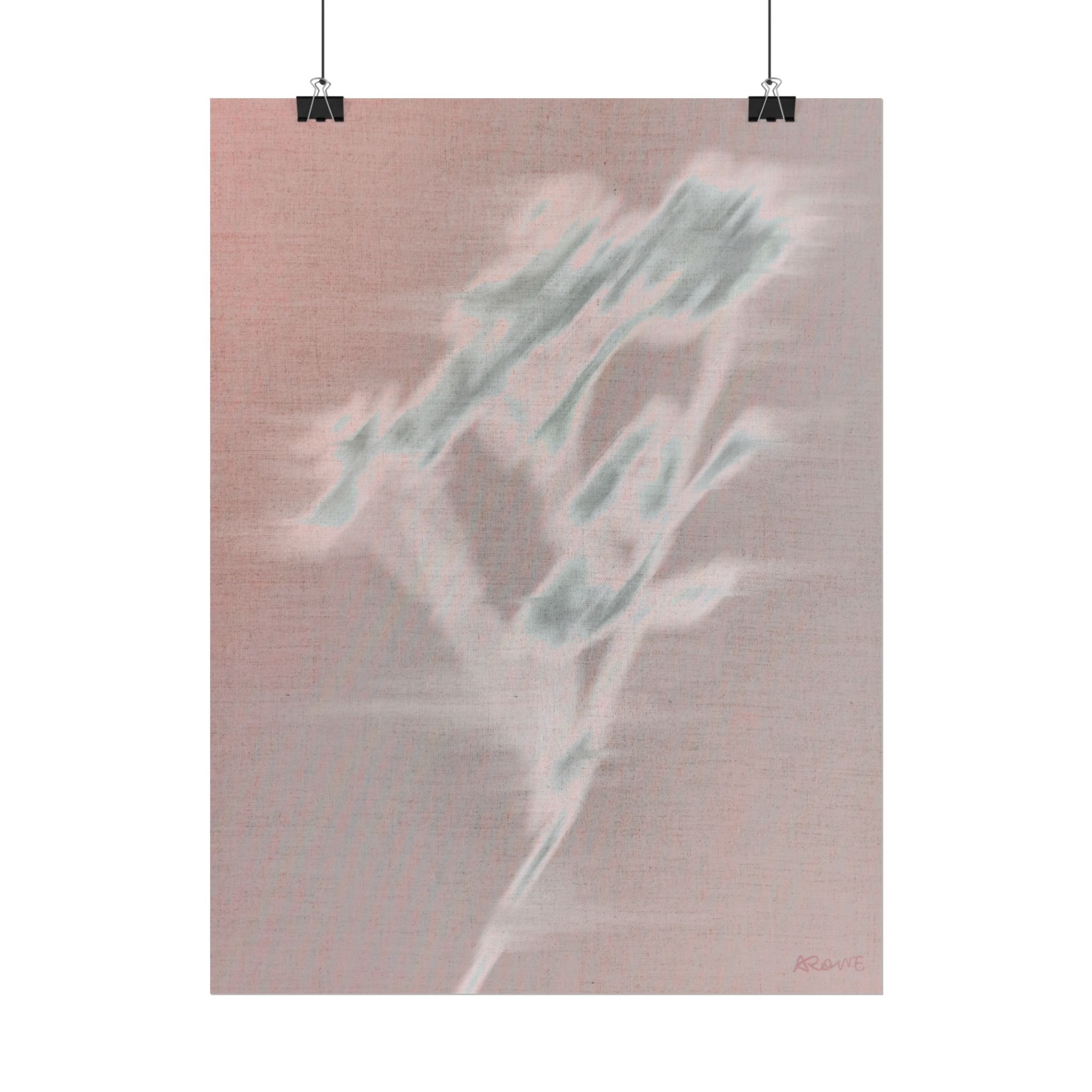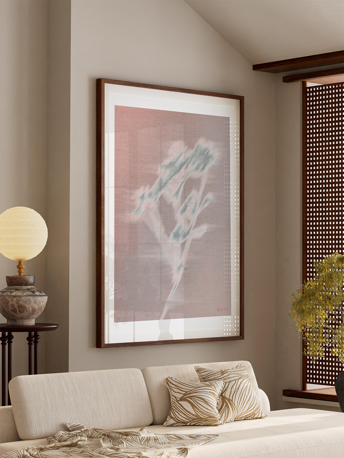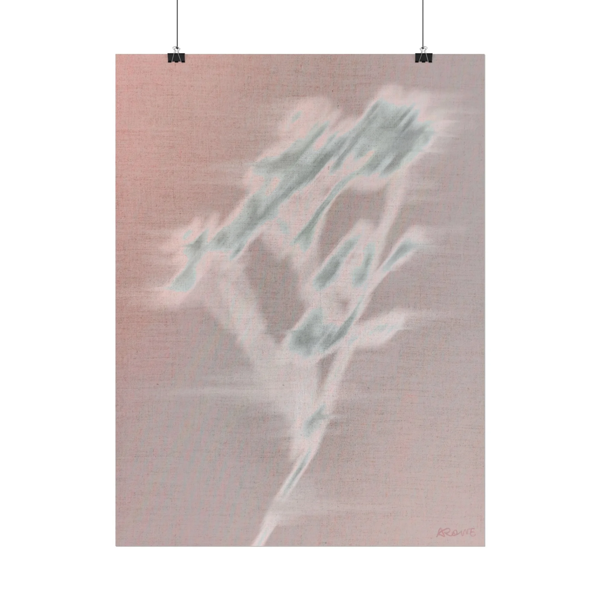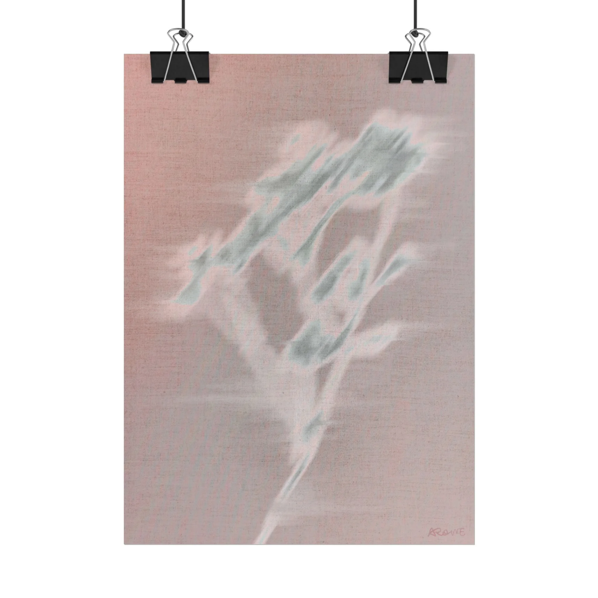 A softly muted botanical poster that feels like a memory caught on paper. Gentle pastel pinks and faded seafoam greens blend into a textured, watercolor-like field where a single floral silhouette drifts across the surface. The result is quiet and contemplative—an artwork that settles into a room without shouting, bringing a restful, vintage atmosphere to bedrooms, reading nooks, or cozy living spaces. Rolled for safe transit, this piece arrives ready to frame or mount and adds a whisper of nature and calm to everyday life.