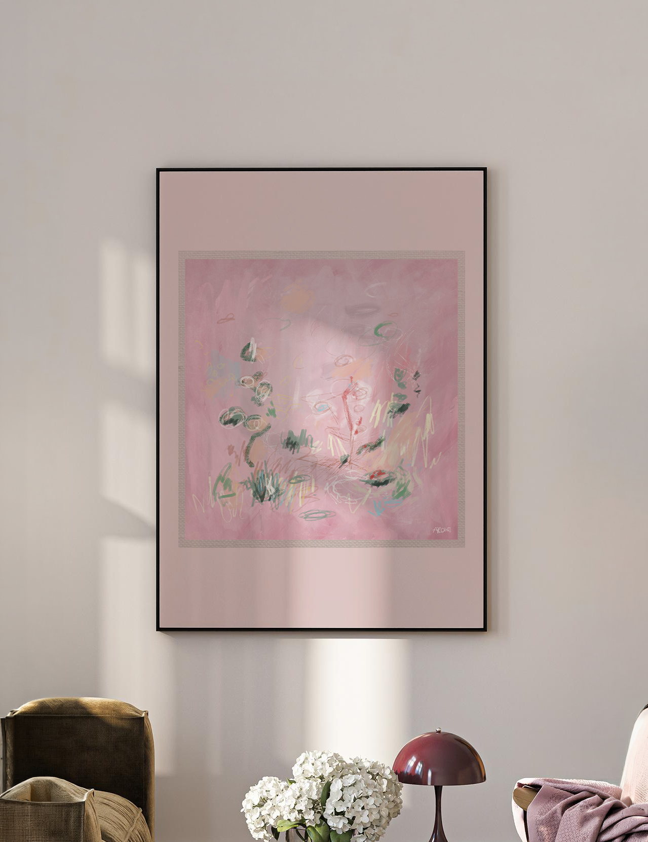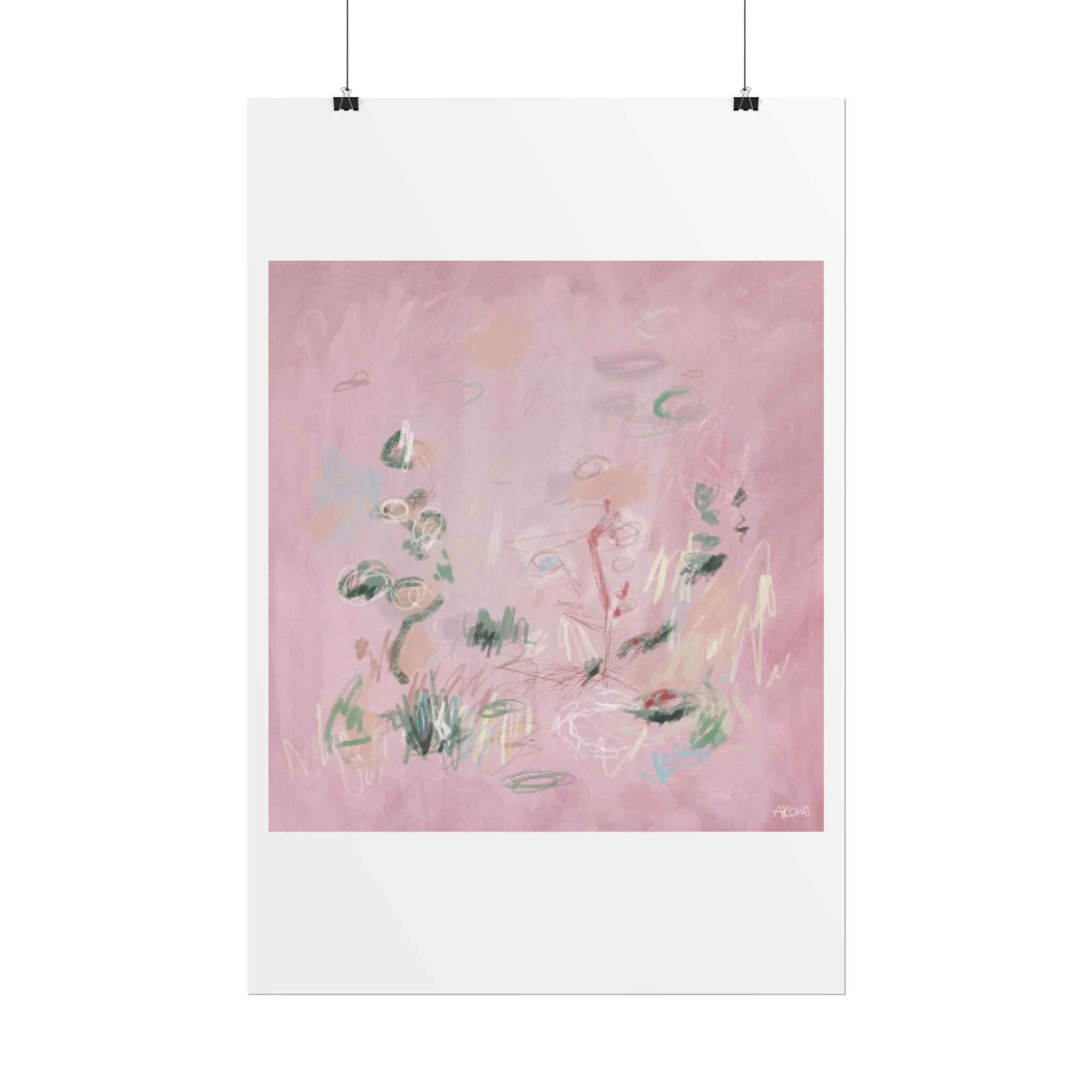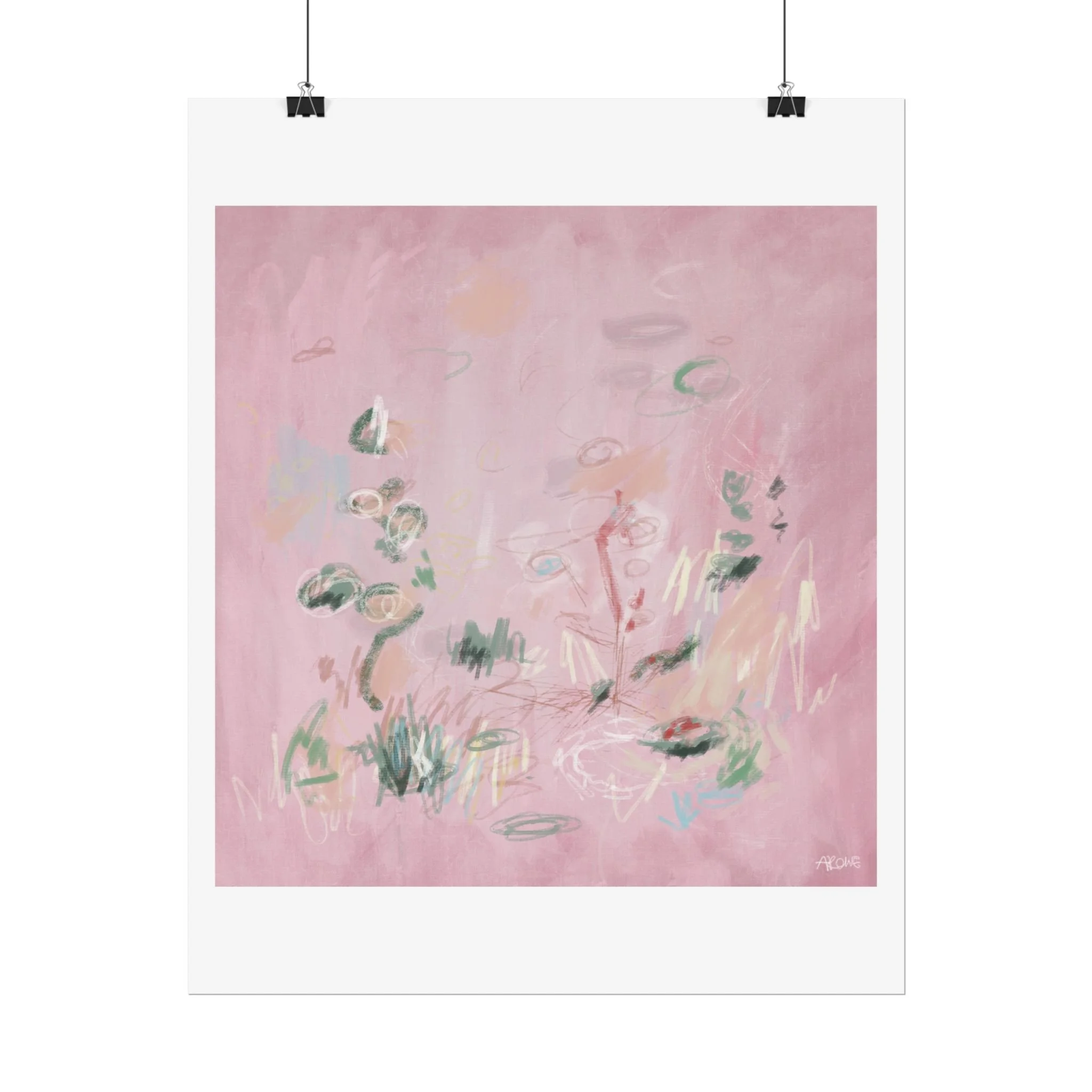 Soft, dreamy abstract blooms float across a wash of rosy pink in this rolled poster. The composition reads like a quiet daydream—whispers of green leaves and pale strokes that suggest movement, light, and gentle growth. Choose from textured fine art, matte, or semi-glossy paper to match the mood: fine art adds painterly depth and archival quality, matte keeps things understated and modern, and semi-glossy gives brighter color and crisp detail. Hung in a reading nook, layered in a gallery wall, or tucked into a frame, this poster brings a calming, intimate energy to spaces that favor subtle color and thoughtful texture.