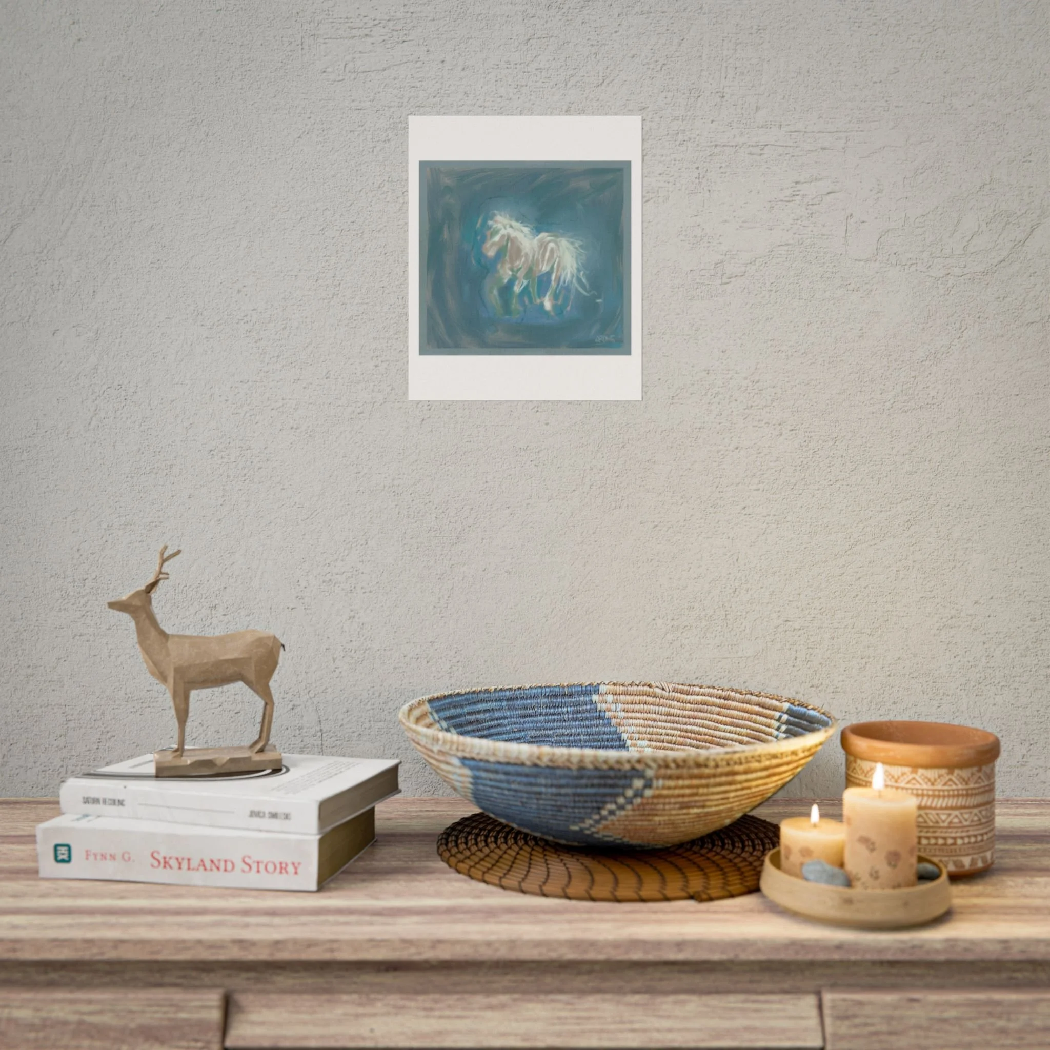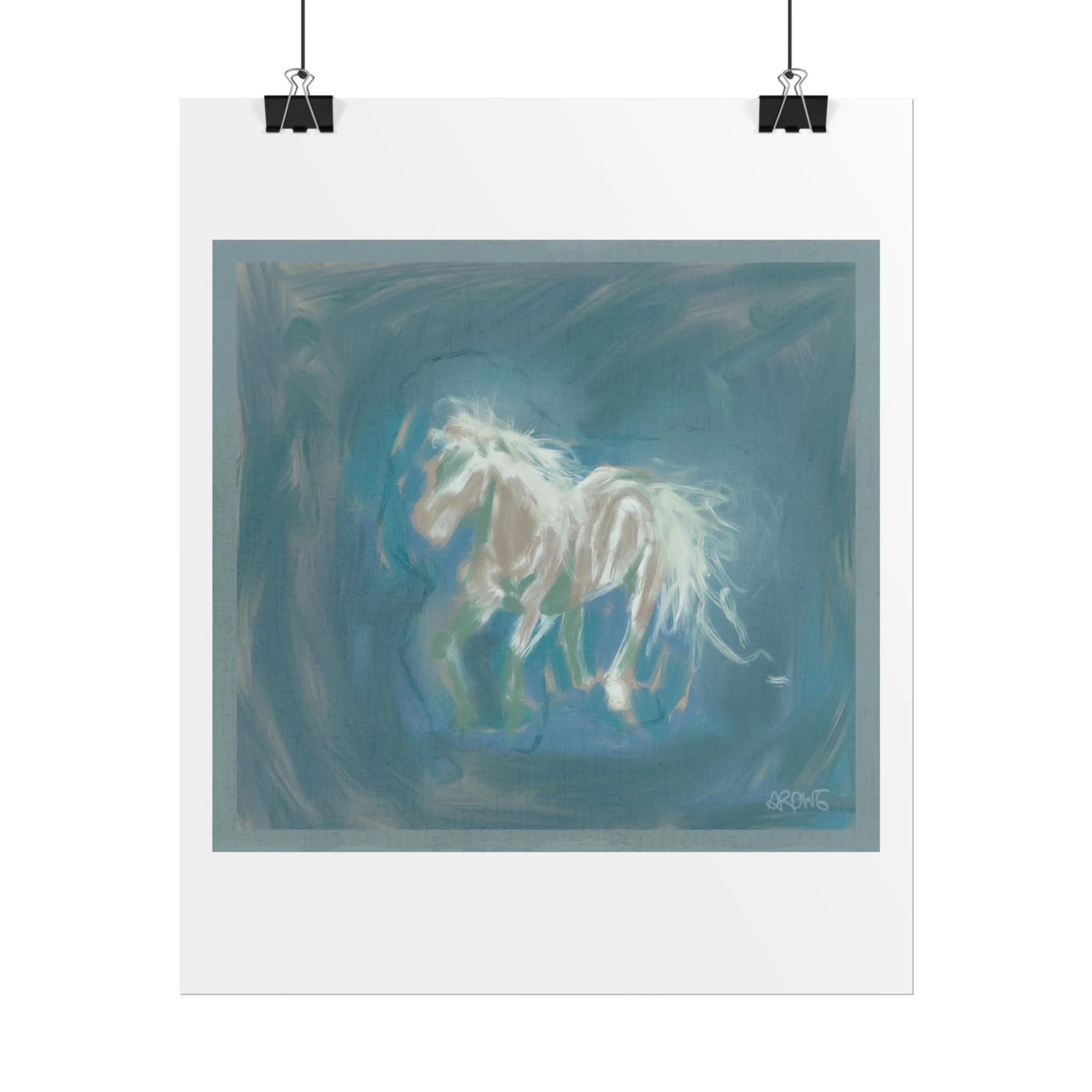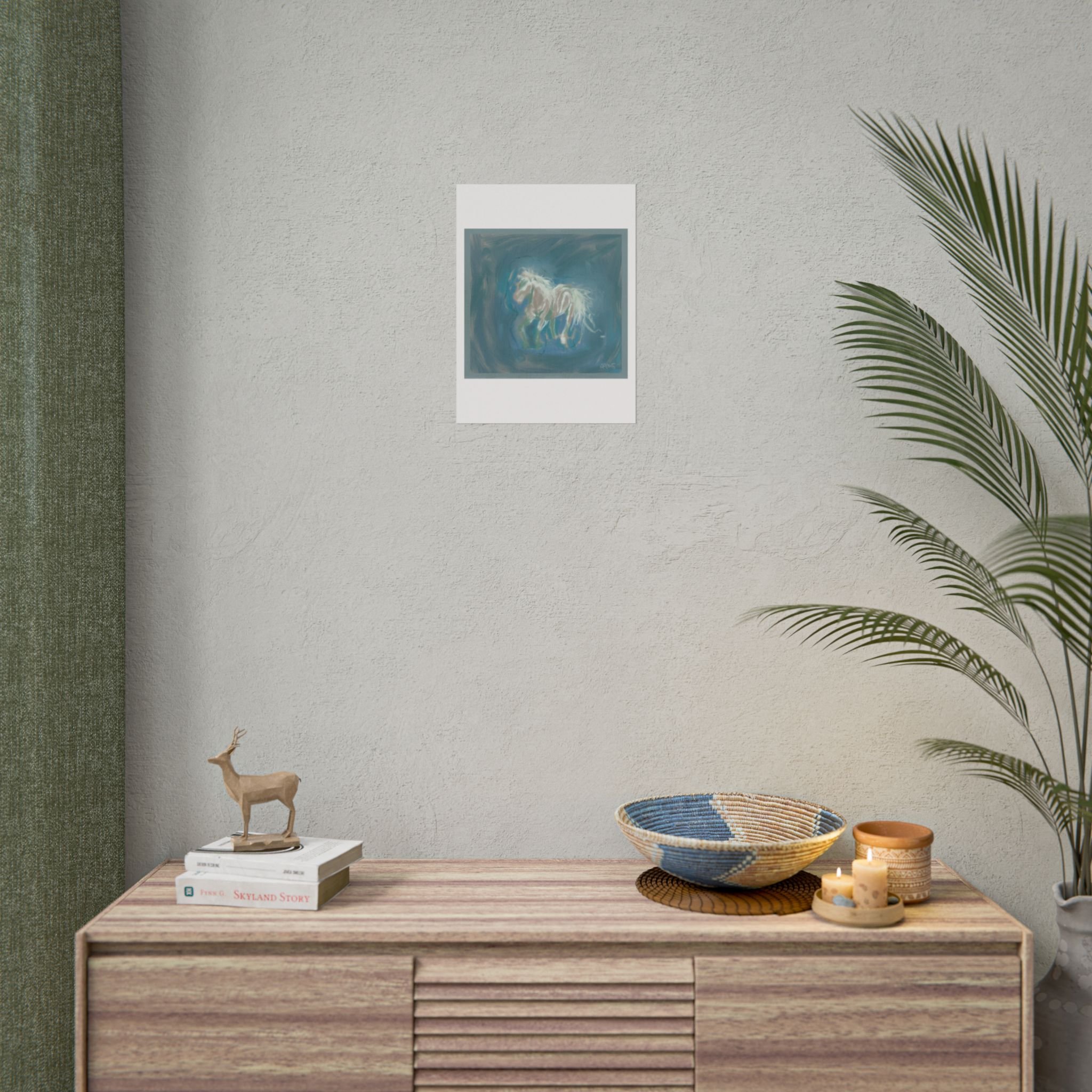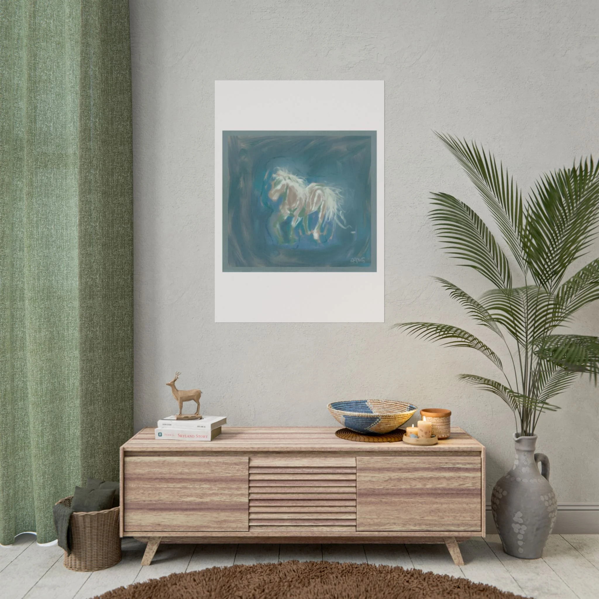 A rolled art poster that brings gentle motion and soft light into any room. The artwork features a dreamy, impressionistic white horse drifting through swirls of teal and slate — brushy textures and luminous highlights that feel like a memory of a seaside dusk. Printed with archival-grade inks on your choice of fine art, semi-glossy, or matte paper, the image retains vivid color and subtle detail whether you frame it or let it float on a gallery wall. Choose horizontal or vertical layout and a size that suits your space; each poster arrives carefully rolled to protect the paper and preserve the layered, painterly strokes. This piece fits a quiet corner, a studio wall, or a calming entryway where soft movement and tranquil tones matter.