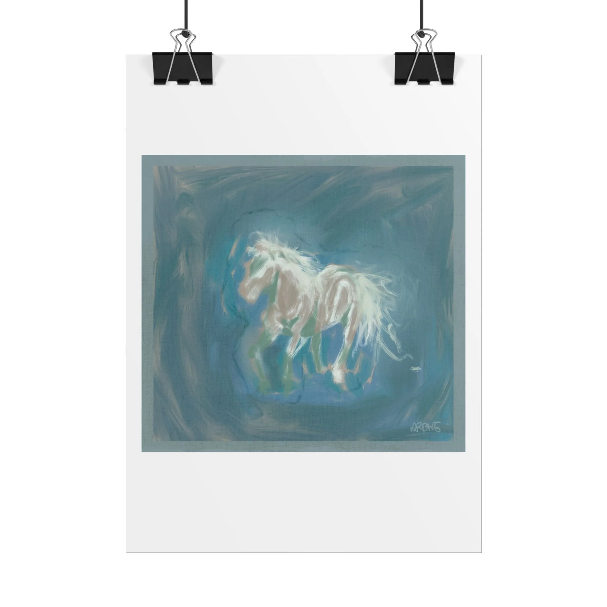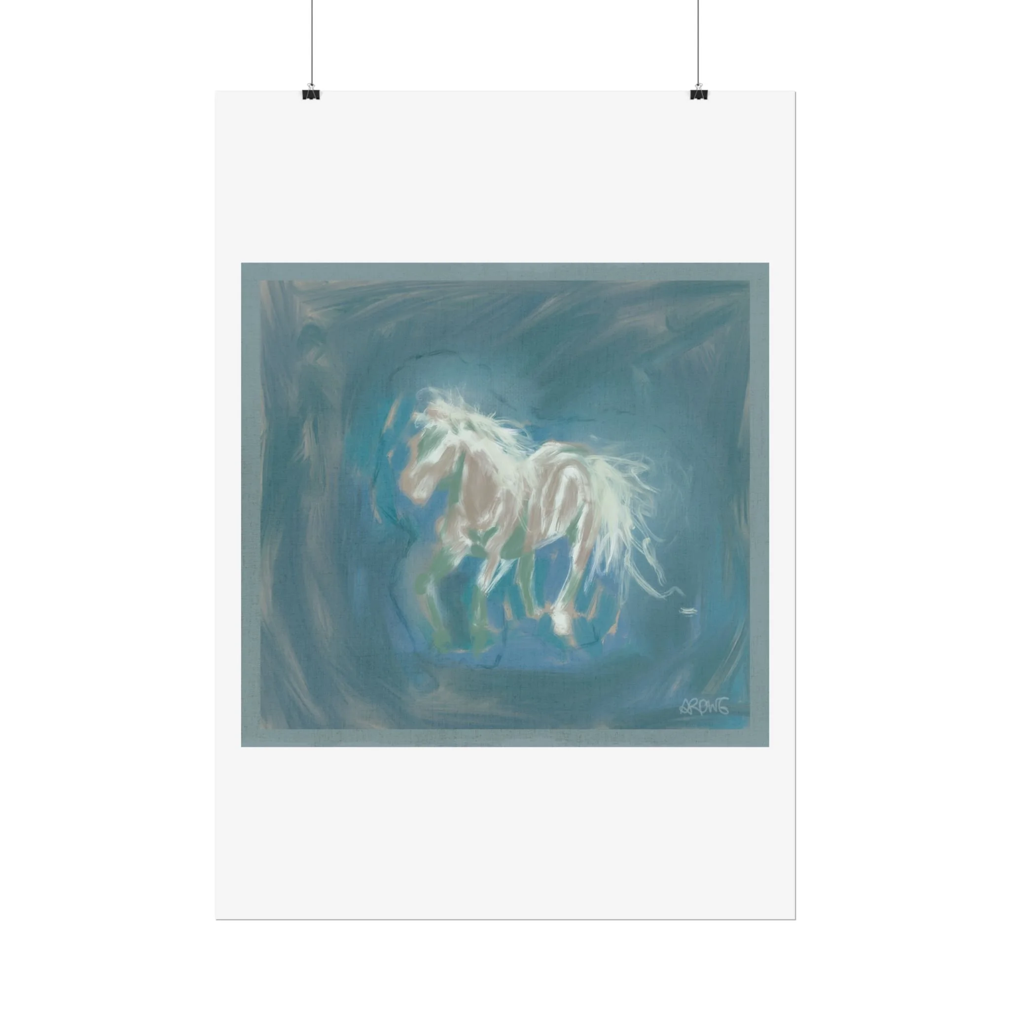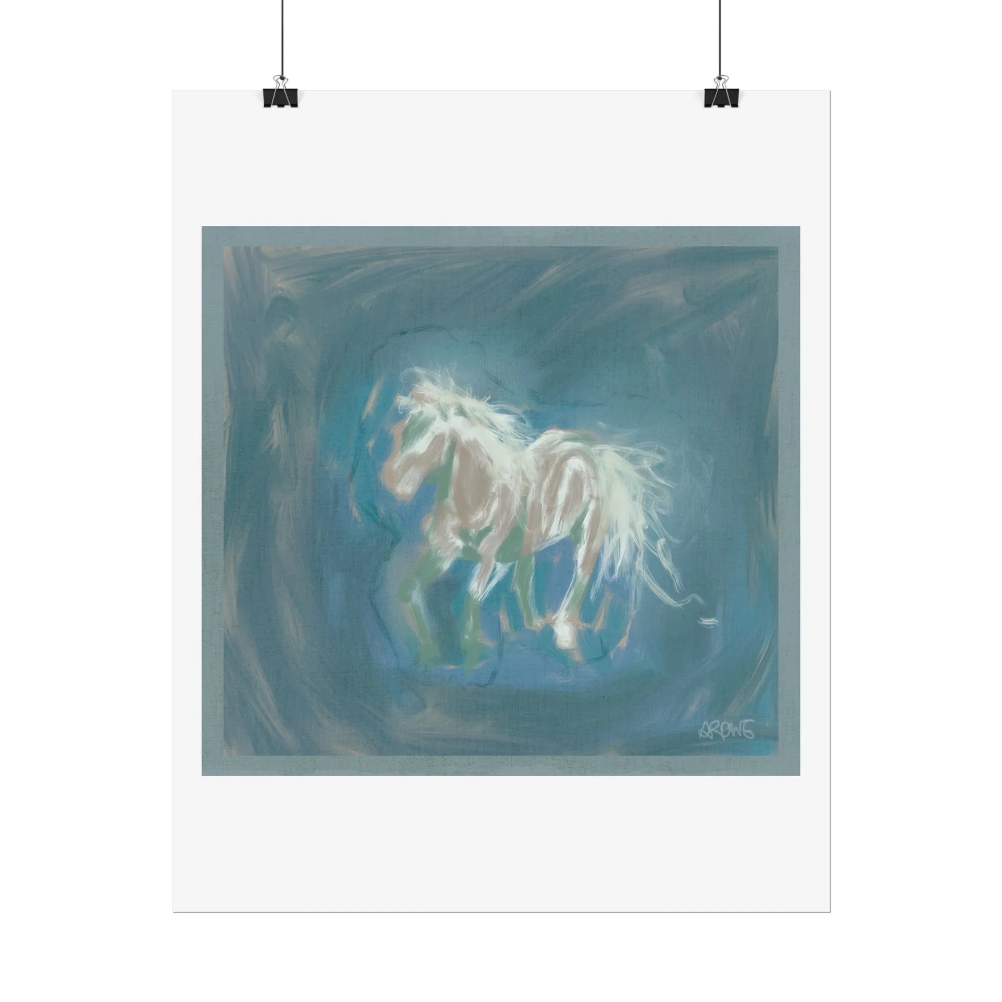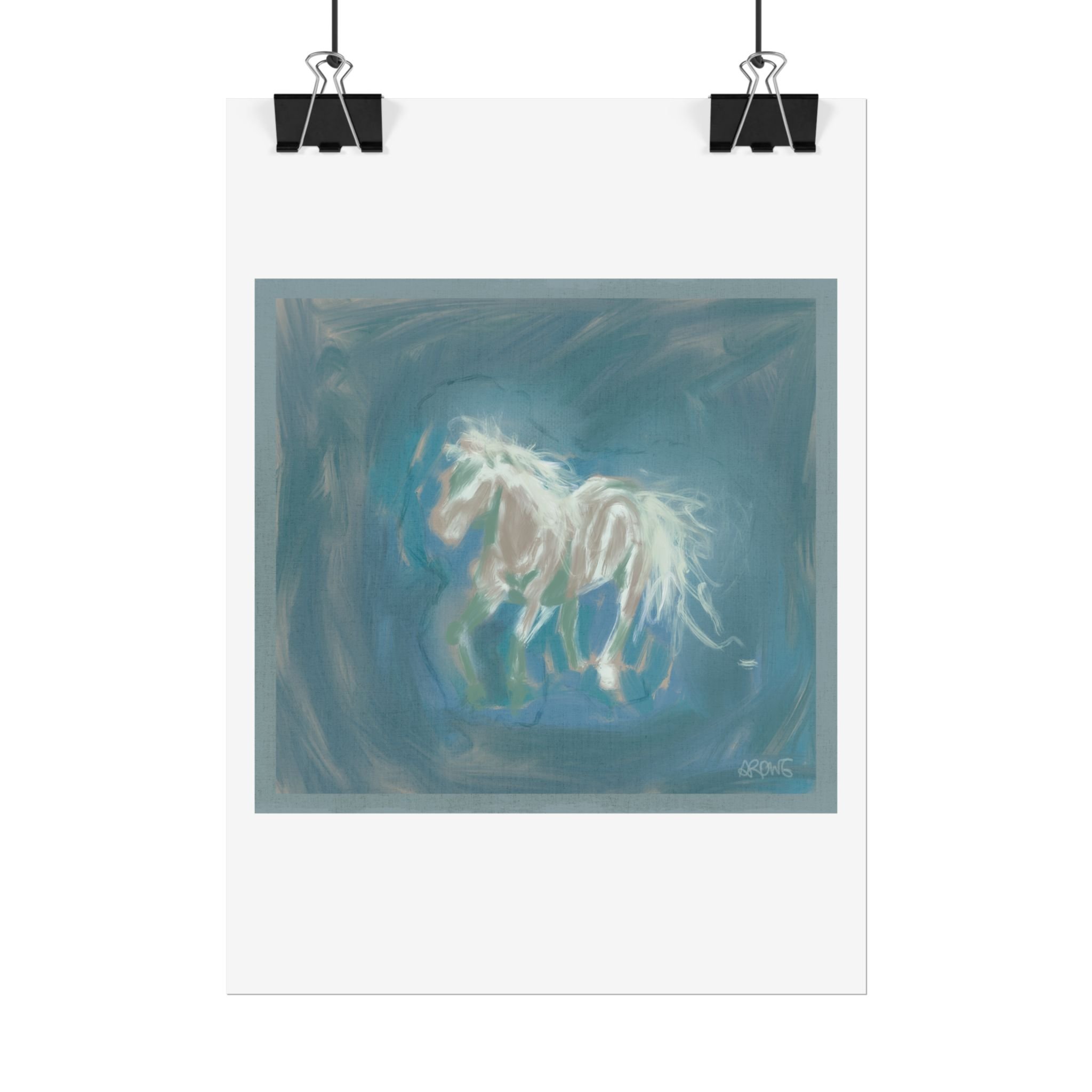 A rolled art poster that brings gentle motion and soft light into any room. The artwork features a dreamy, impressionistic white horse drifting through swirls of teal and slate — brushy textures and luminous highlights that feel like a memory of a seaside dusk. Printed with archival-grade inks on your choice of fine art, semi-glossy, or matte paper, the image retains vivid color and subtle detail whether you frame it or let it float on a gallery wall. Choose horizontal or vertical layout and a size that suits your space; each poster arrives carefully rolled to protect the paper and preserve the layered, painterly strokes. This piece fits a quiet corner, a studio wall, or a calming entryway where soft movement and tranquil tones matter.