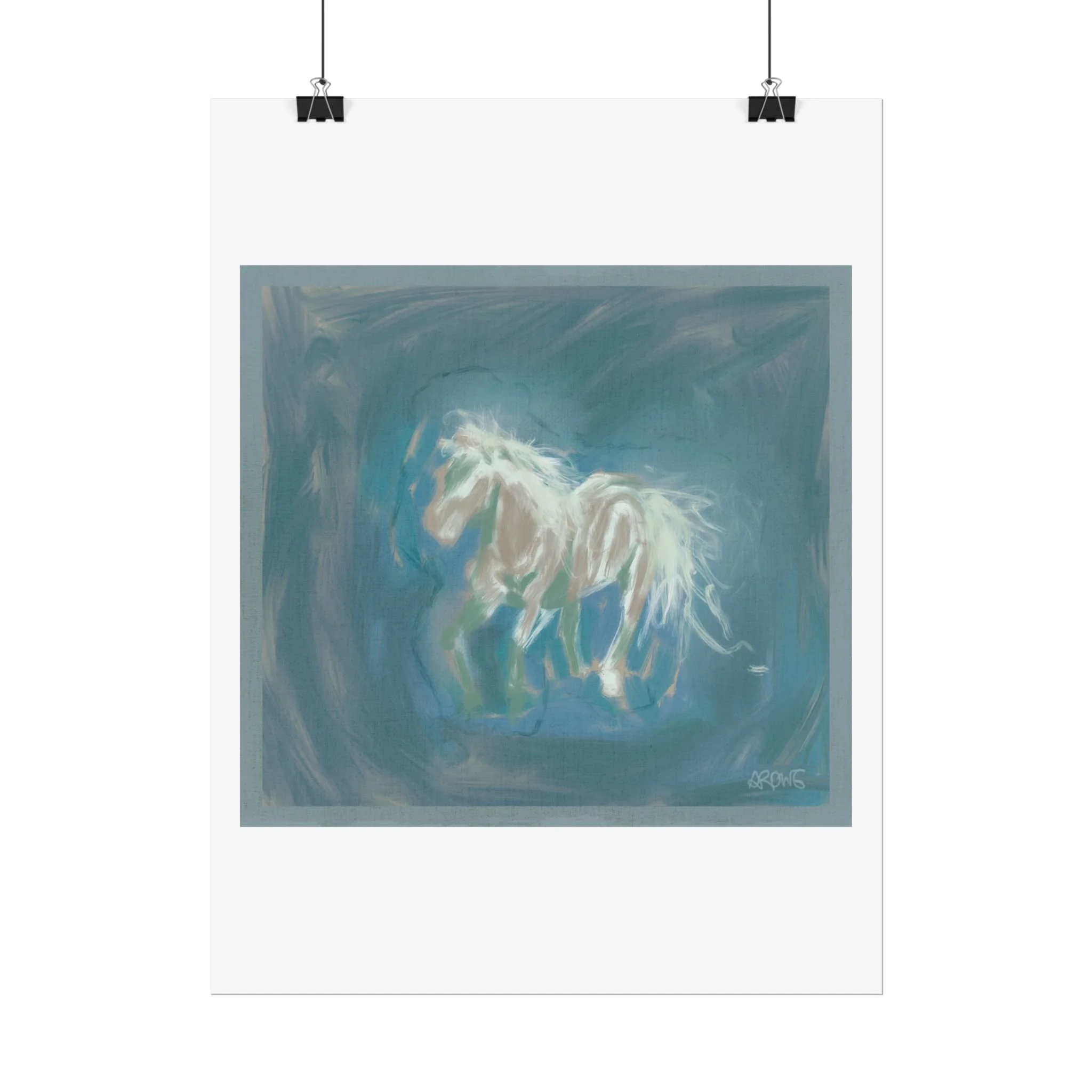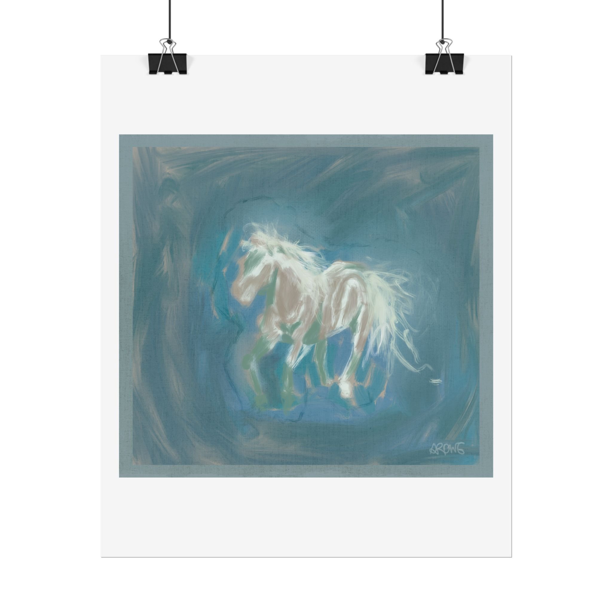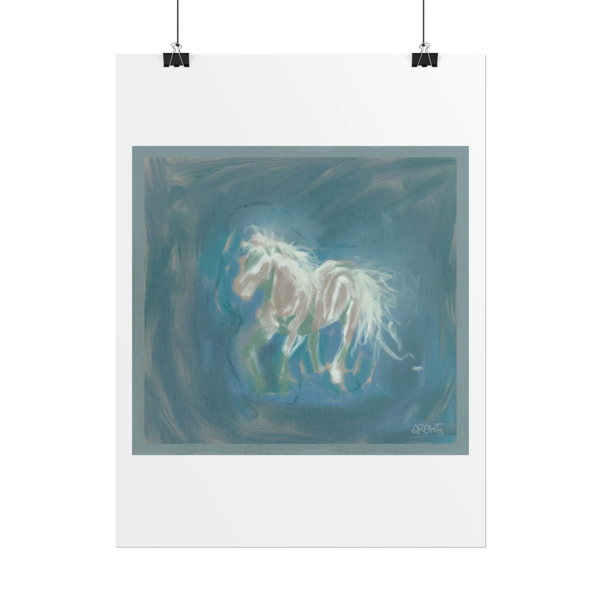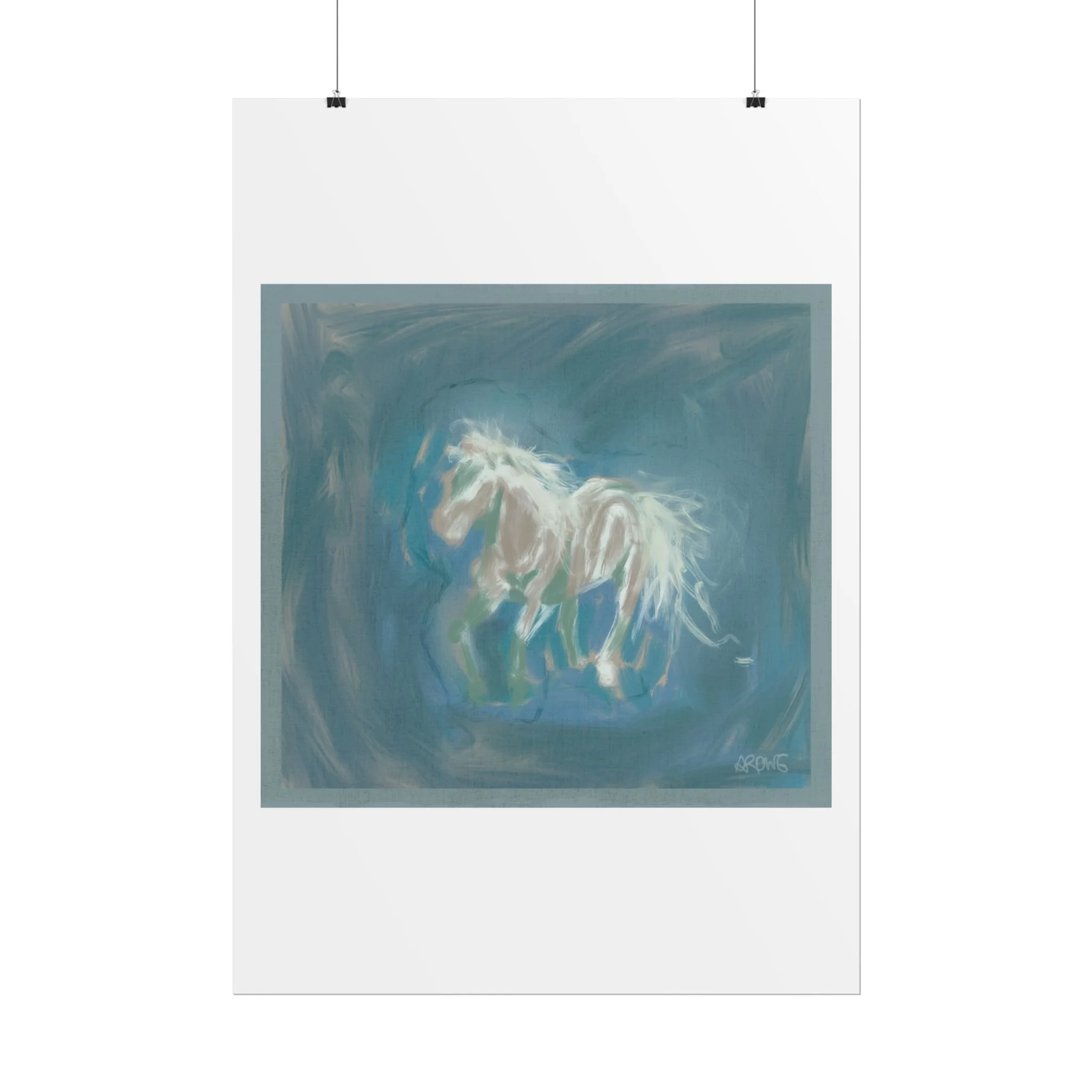 A rolled art poster that brings gentle motion and soft light into any room. The artwork features a dreamy, impressionistic white horse drifting through swirls of teal and slate — brushy textures and luminous highlights that feel like a memory of a seaside dusk. Printed with archival-grade inks on your choice of fine art, semi-glossy, or matte paper, the image retains vivid color and subtle detail whether you frame it or let it float on a gallery wall. Choose horizontal or vertical layout and a size that suits your space; each poster arrives carefully rolled to protect the paper and preserve the layered, painterly strokes. This piece fits a quiet corner, a studio wall, or a calming entryway where soft movement and tranquil tones matter.