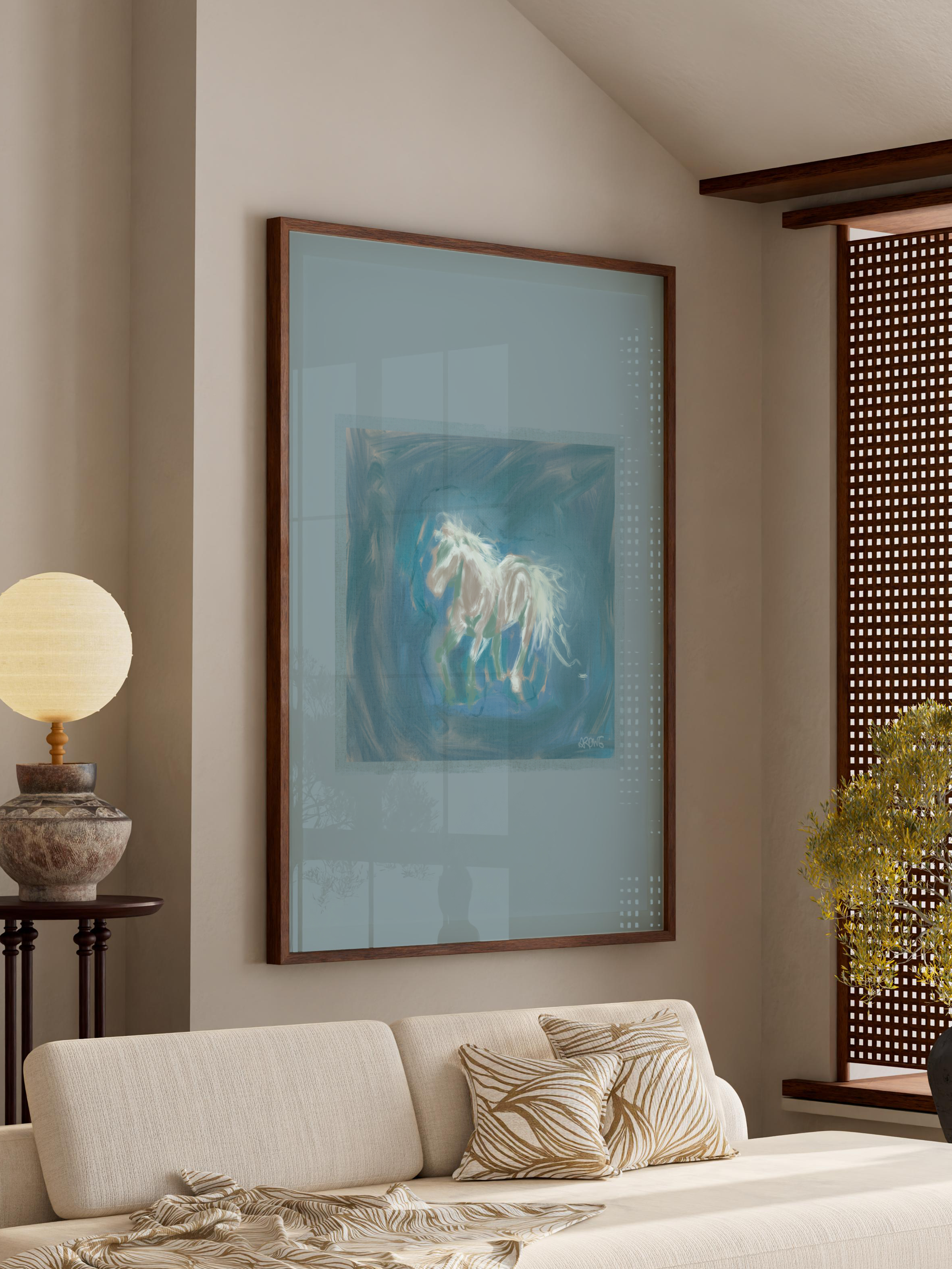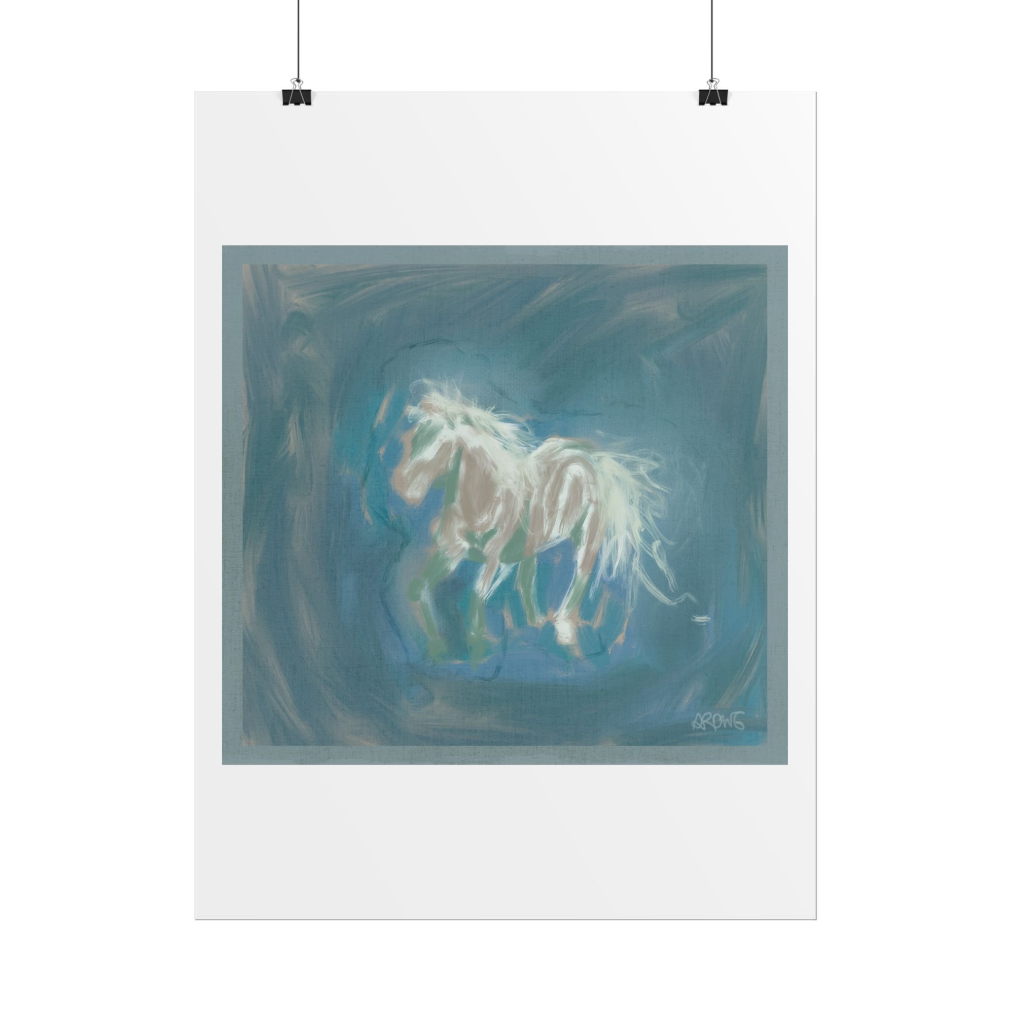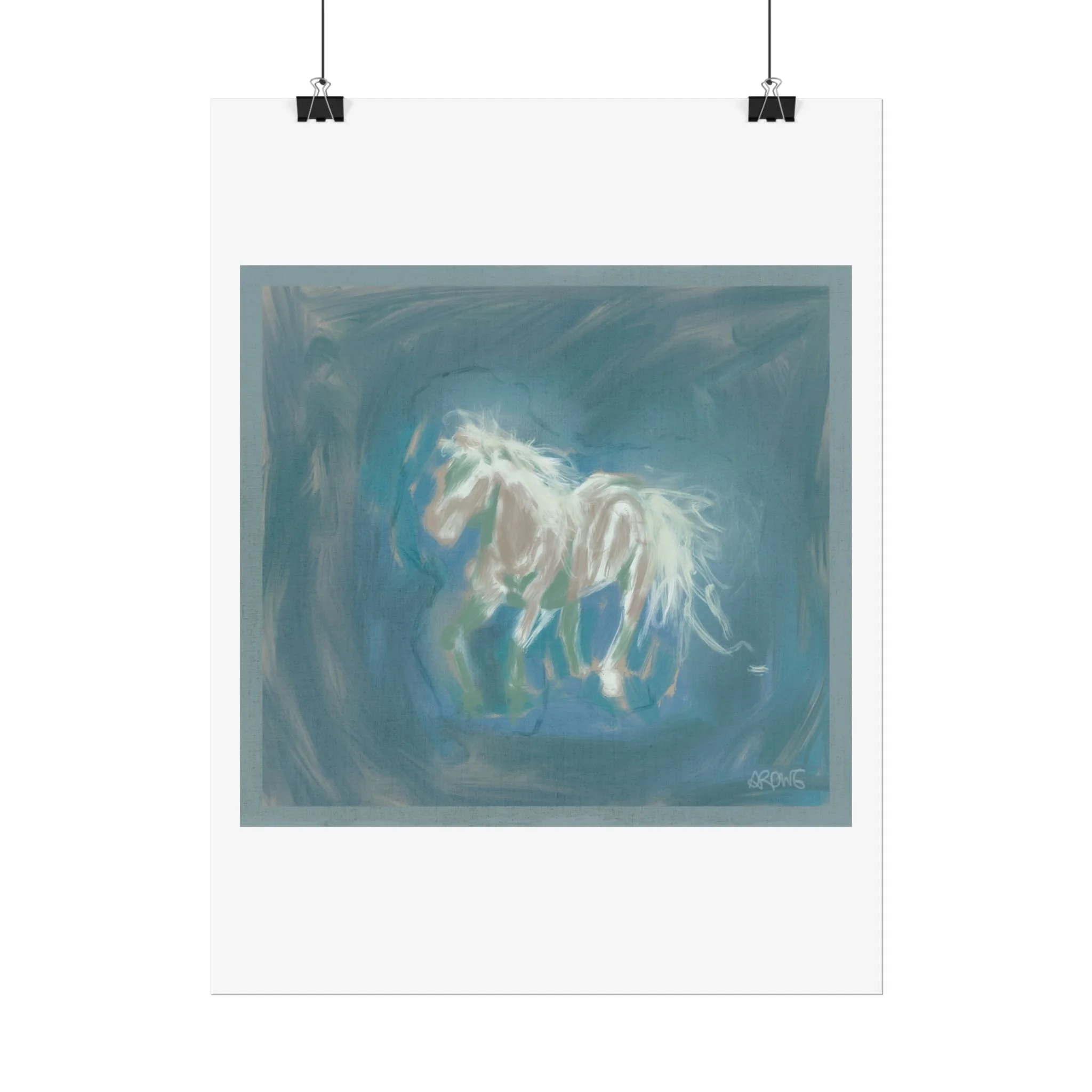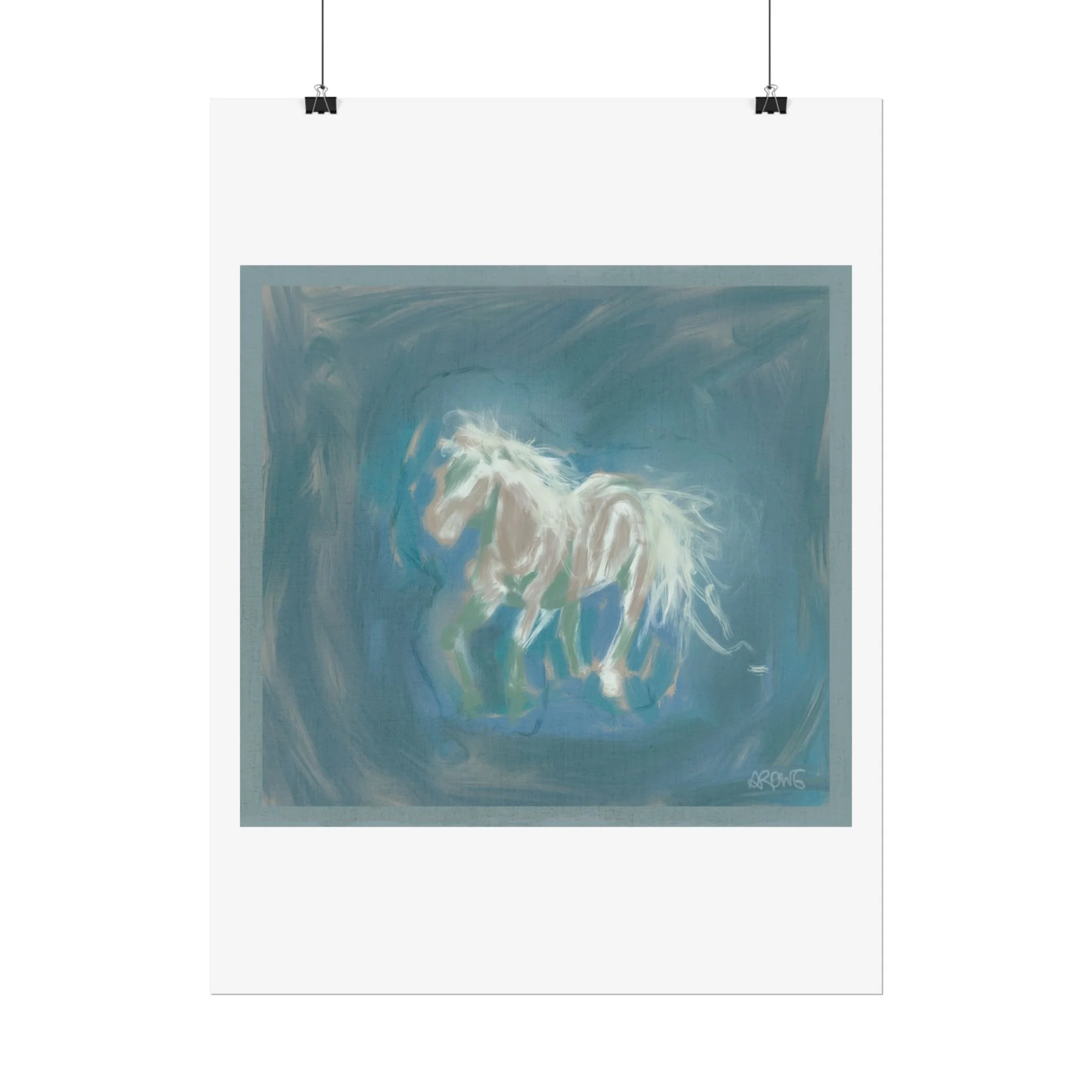 A rolled art poster that brings gentle motion and soft light into any room. The artwork features a dreamy, impressionistic white horse drifting through swirls of teal and slate — brushy textures and luminous highlights that feel like a memory of a seaside dusk. Printed with archival-grade inks on your choice of fine art, semi-glossy, or matte paper, the image retains vivid color and subtle detail whether you frame it or let it float on a gallery wall. Choose horizontal or vertical layout and a size that suits your space; each poster arrives carefully rolled to protect the paper and preserve the layered, painterly strokes. This piece fits a quiet corner, a studio wall, or a calming entryway where soft movement and tranquil tones matter.