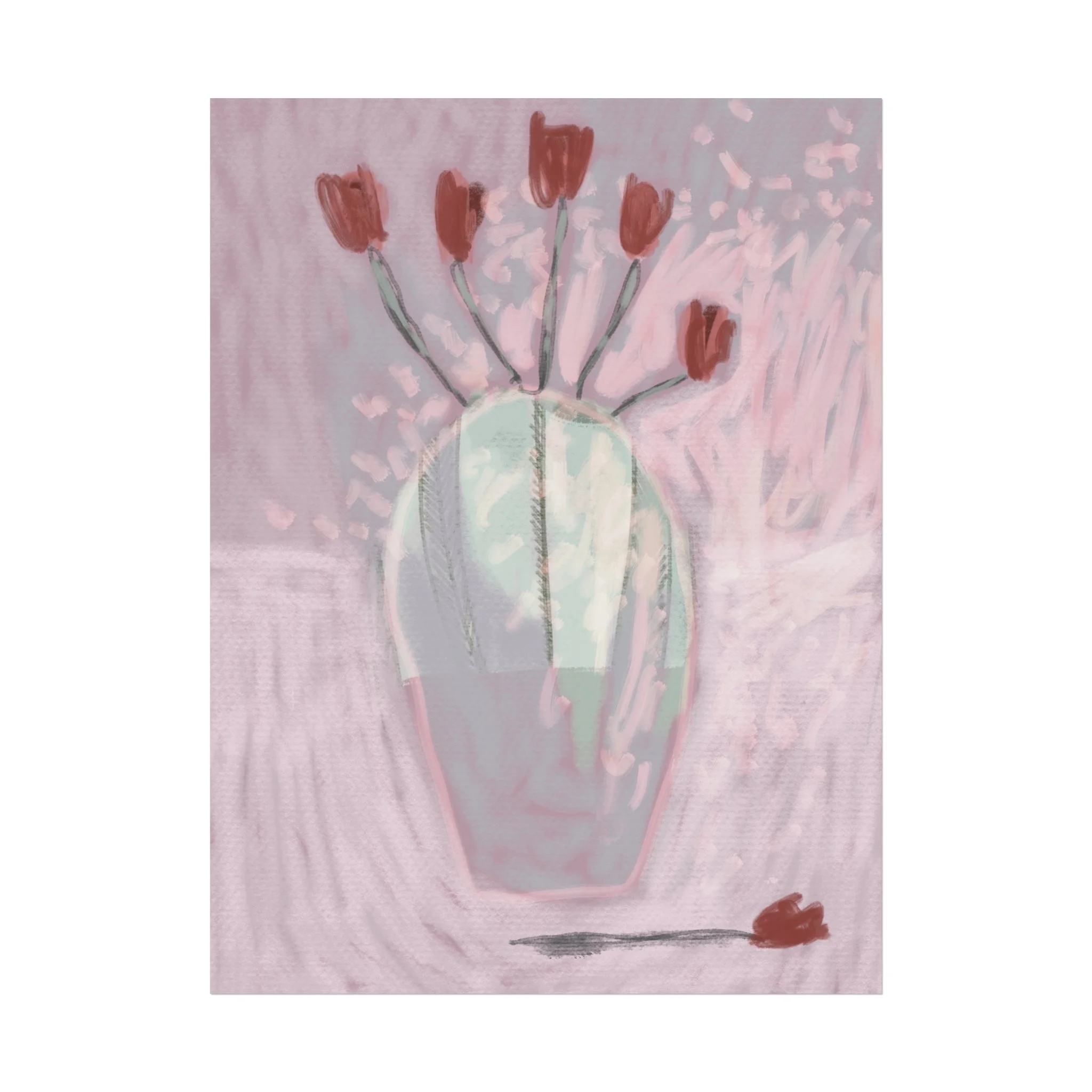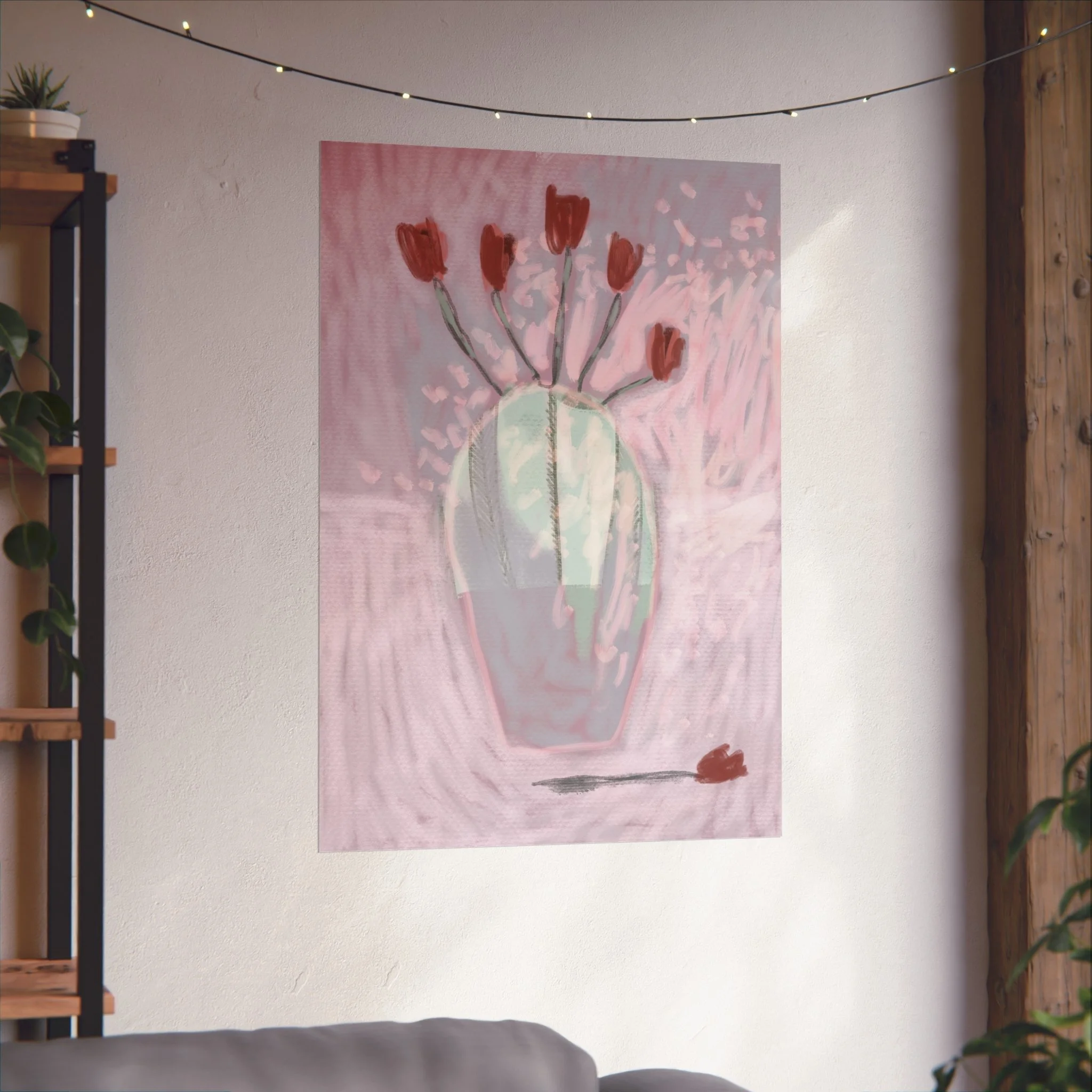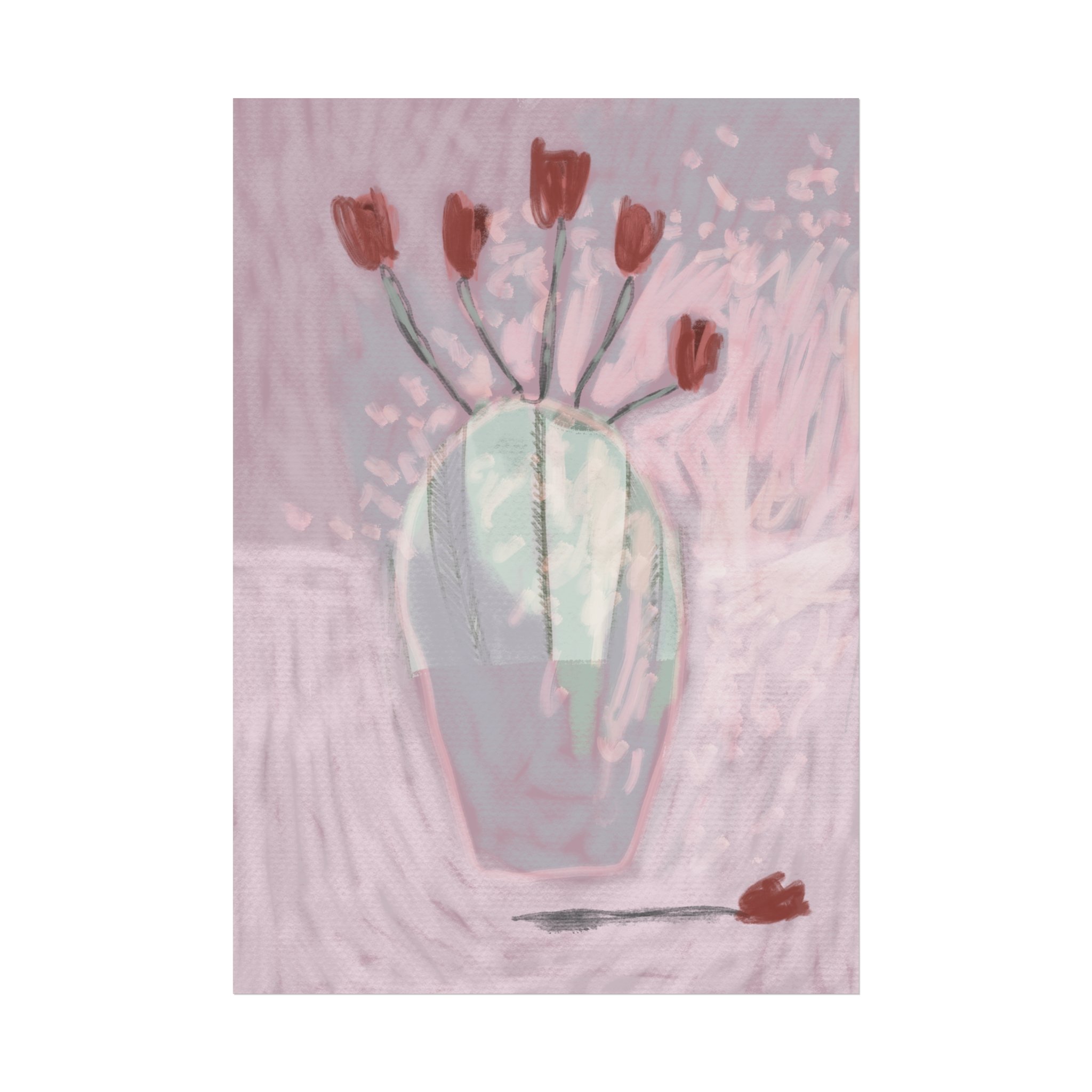 Soft, painterly blooms catch the light in this fine art poster — a dreamy study in muted pinks, sage, and terracotta. The hand-rendered vase and scattered tulips feel intimate and quiet, like the hush after an afternoon rain. Hung above a reading nook or leaned on a mantel, the piece brings a calming, art-studio atmosphere and a gentle touch of modern romance to everyday rooms. Its painterly texture and understated palette let it blend with boho layers or minimalist spaces, inviting slow moments and thoughtful conversation.