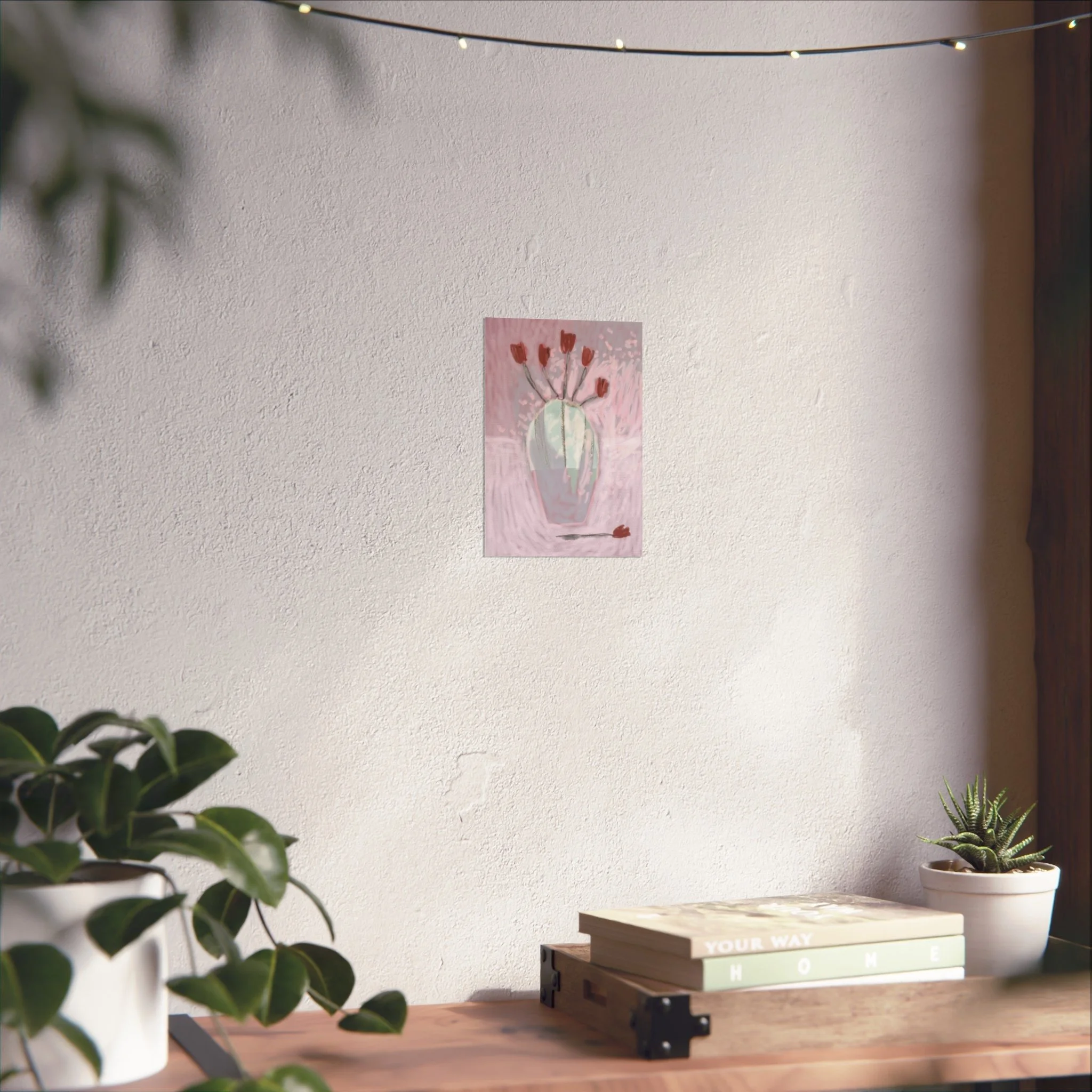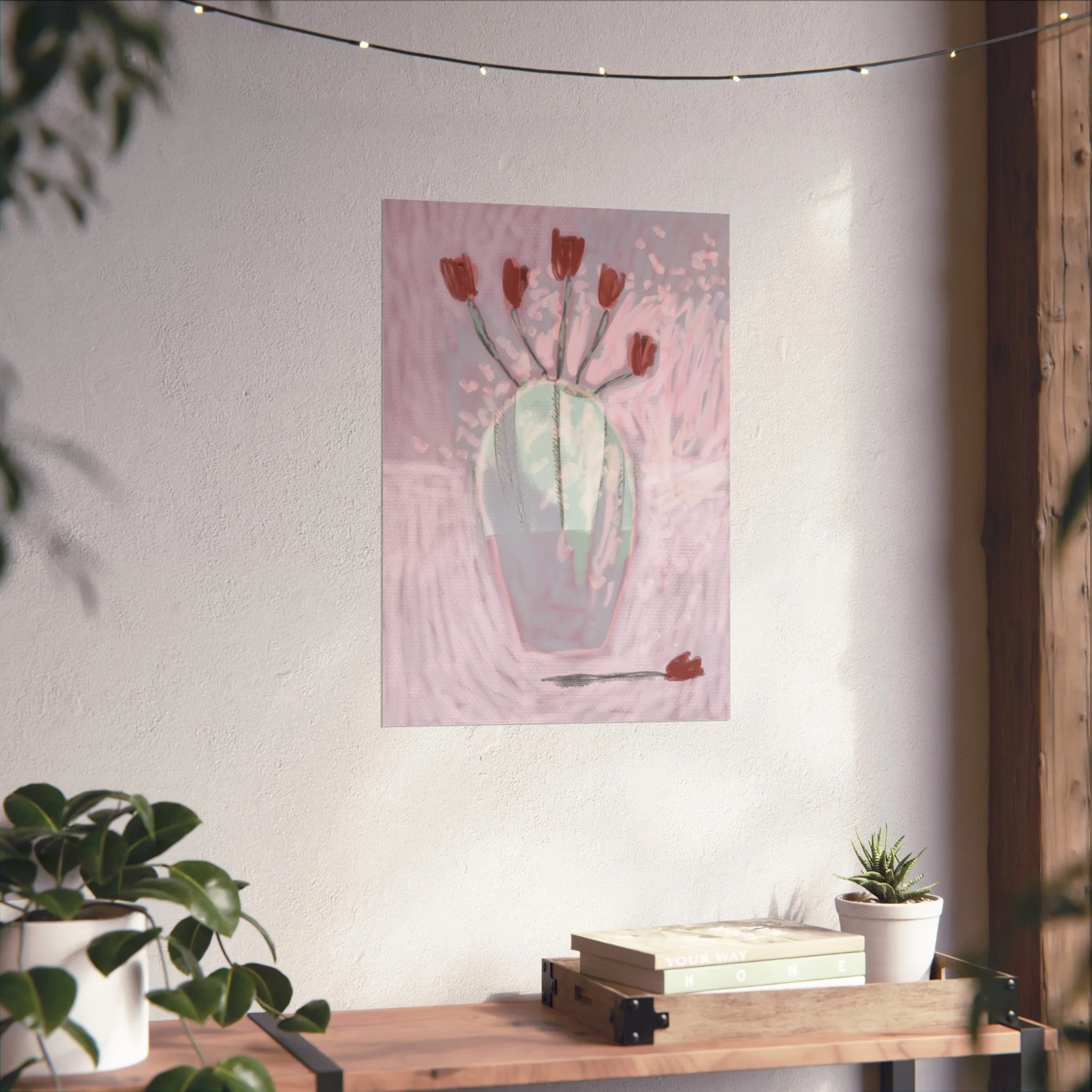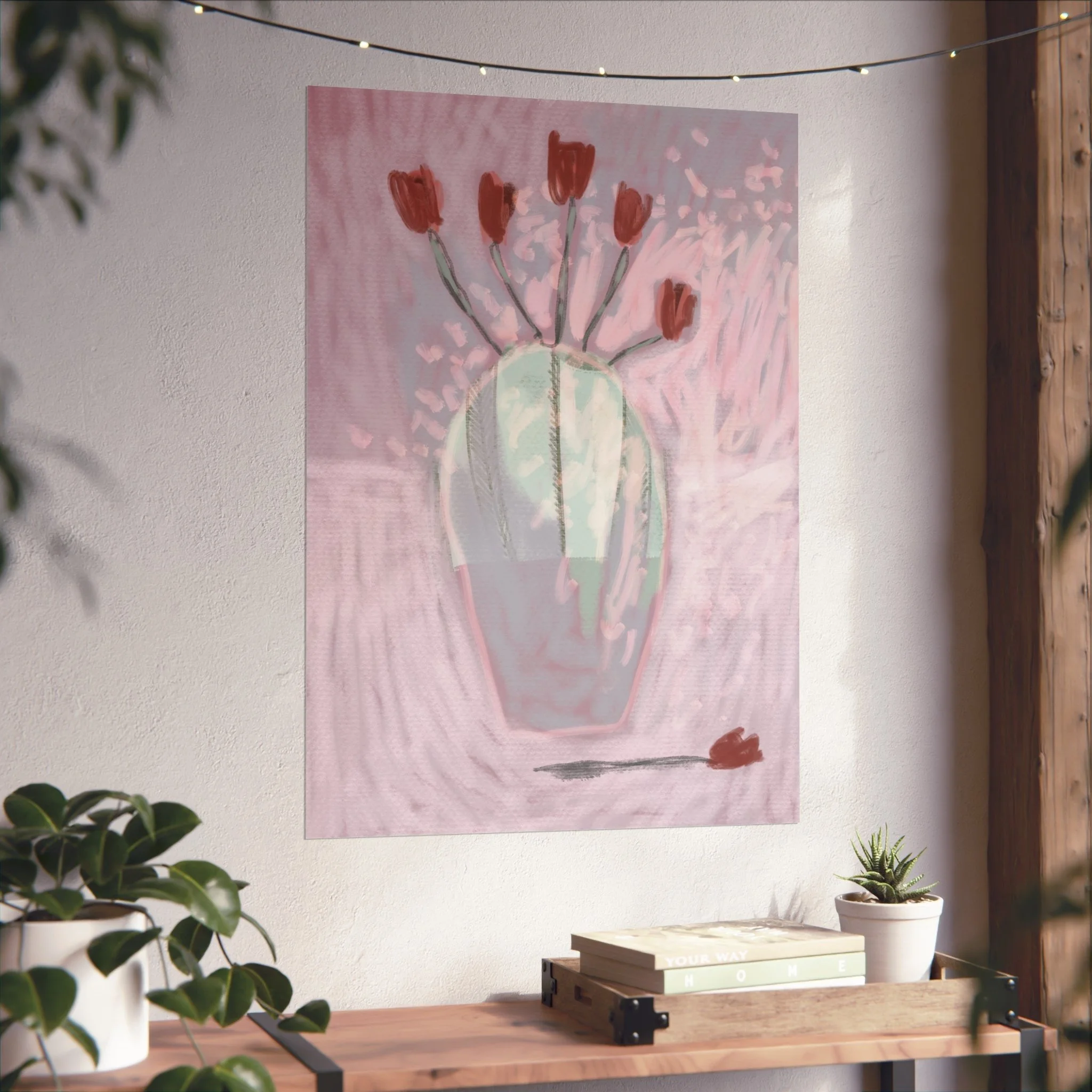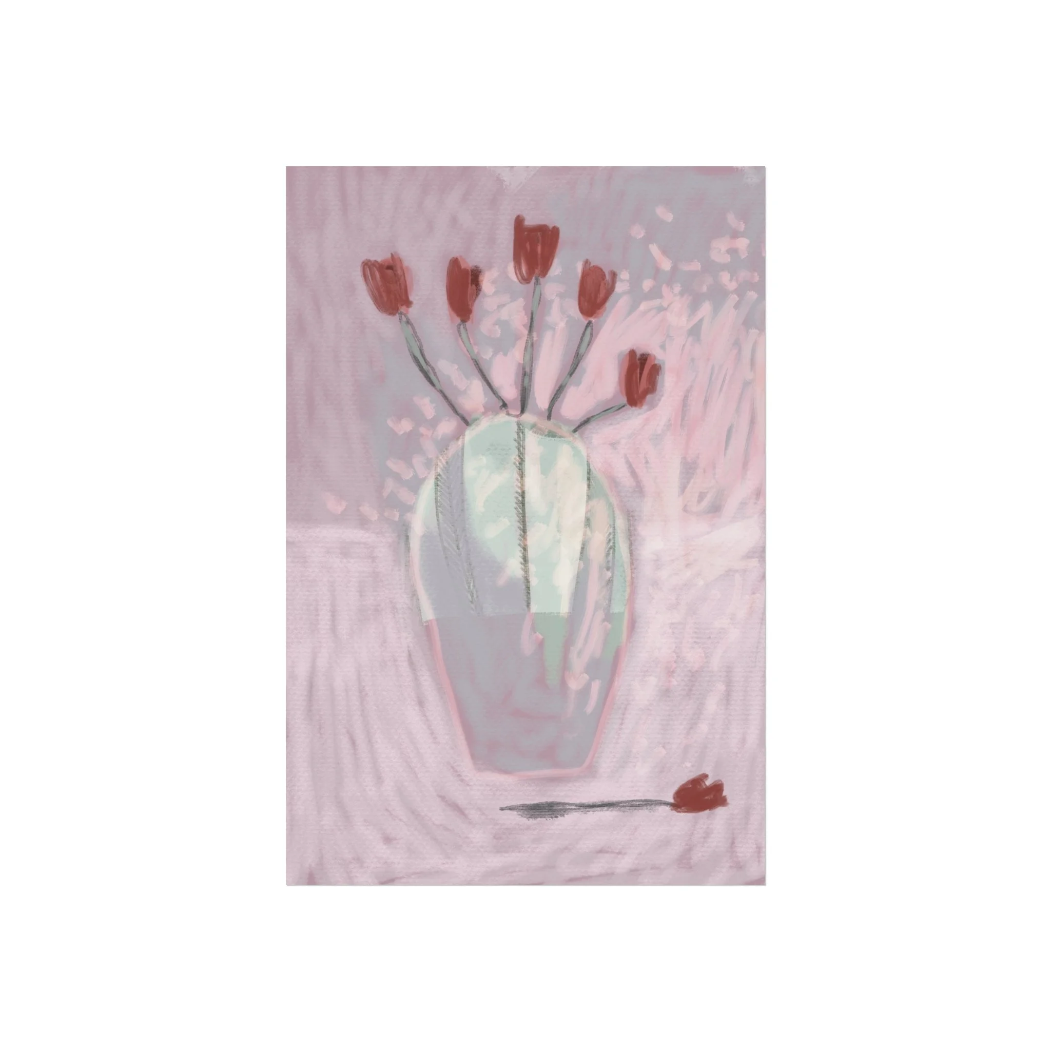 Soft, painterly blooms catch the light in this fine art poster — a dreamy study in muted pinks, sage, and terracotta. The hand-rendered vase and scattered tulips feel intimate and quiet, like the hush after an afternoon rain. Hung above a reading nook or leaned on a mantel, the piece brings a calming, art-studio atmosphere and a gentle touch of modern romance to everyday rooms. Its painterly texture and understated palette let it blend with boho layers or minimalist spaces, inviting slow moments and thoughtful conversation.