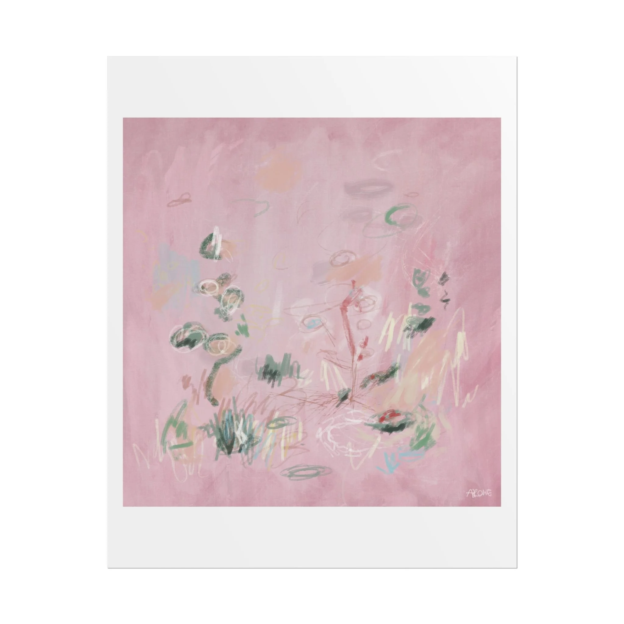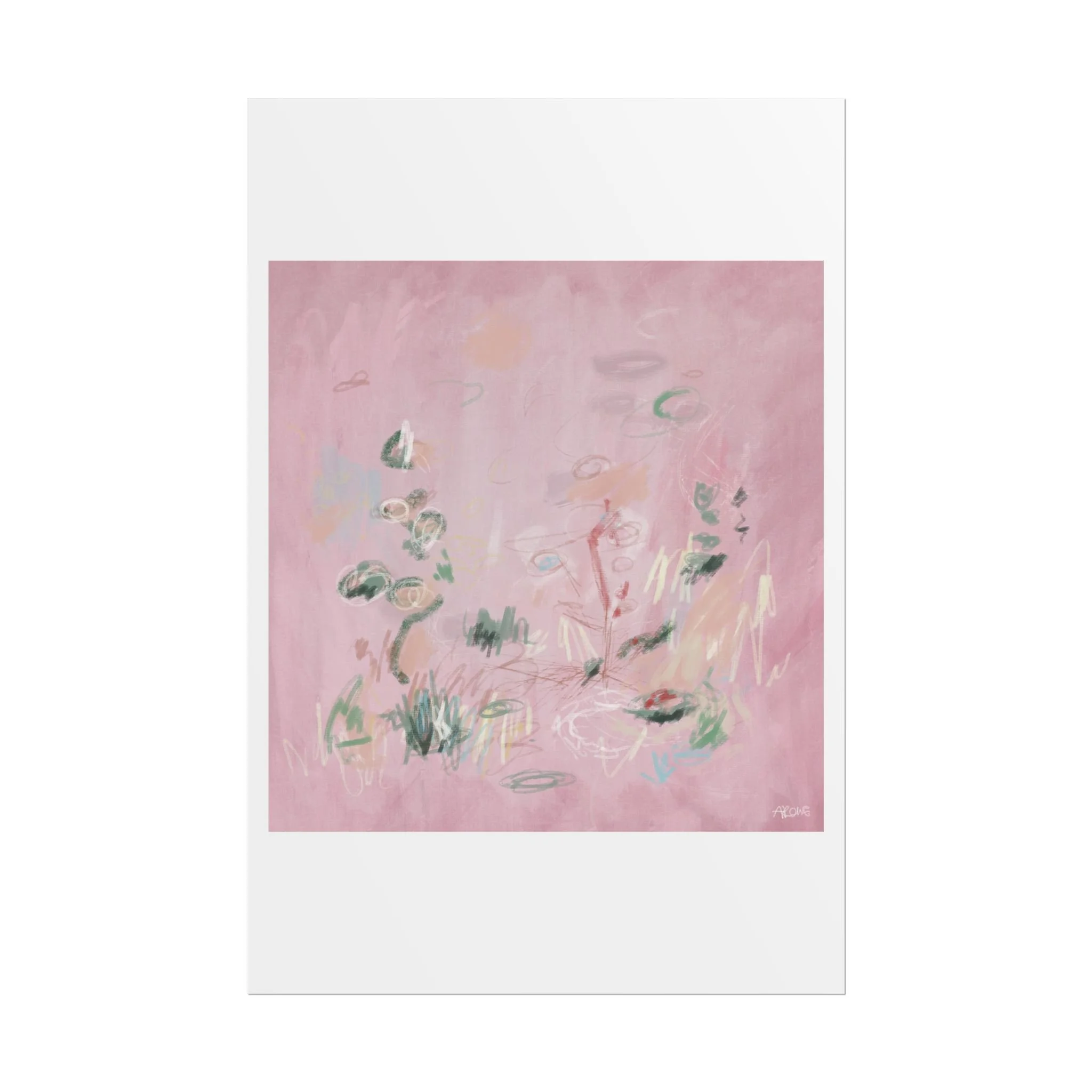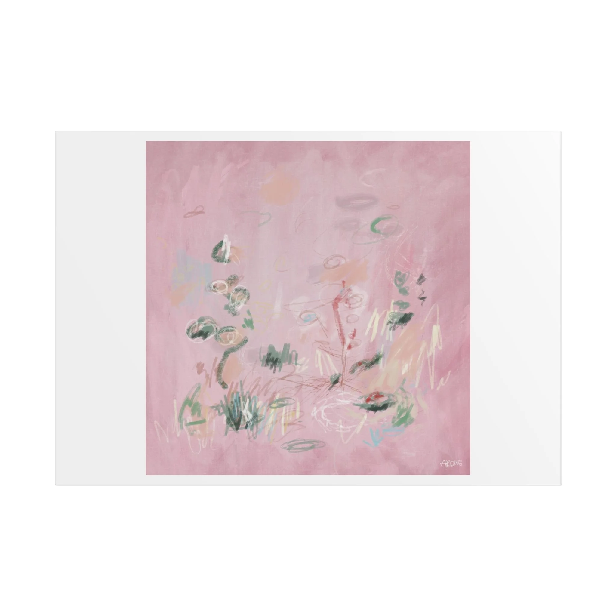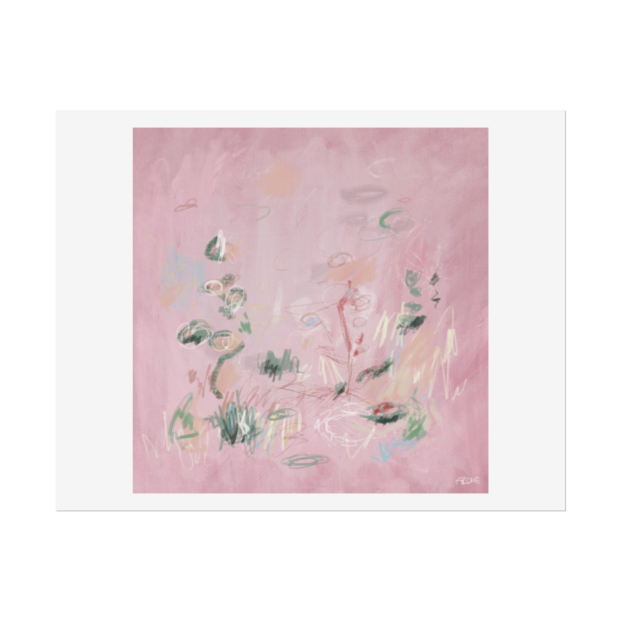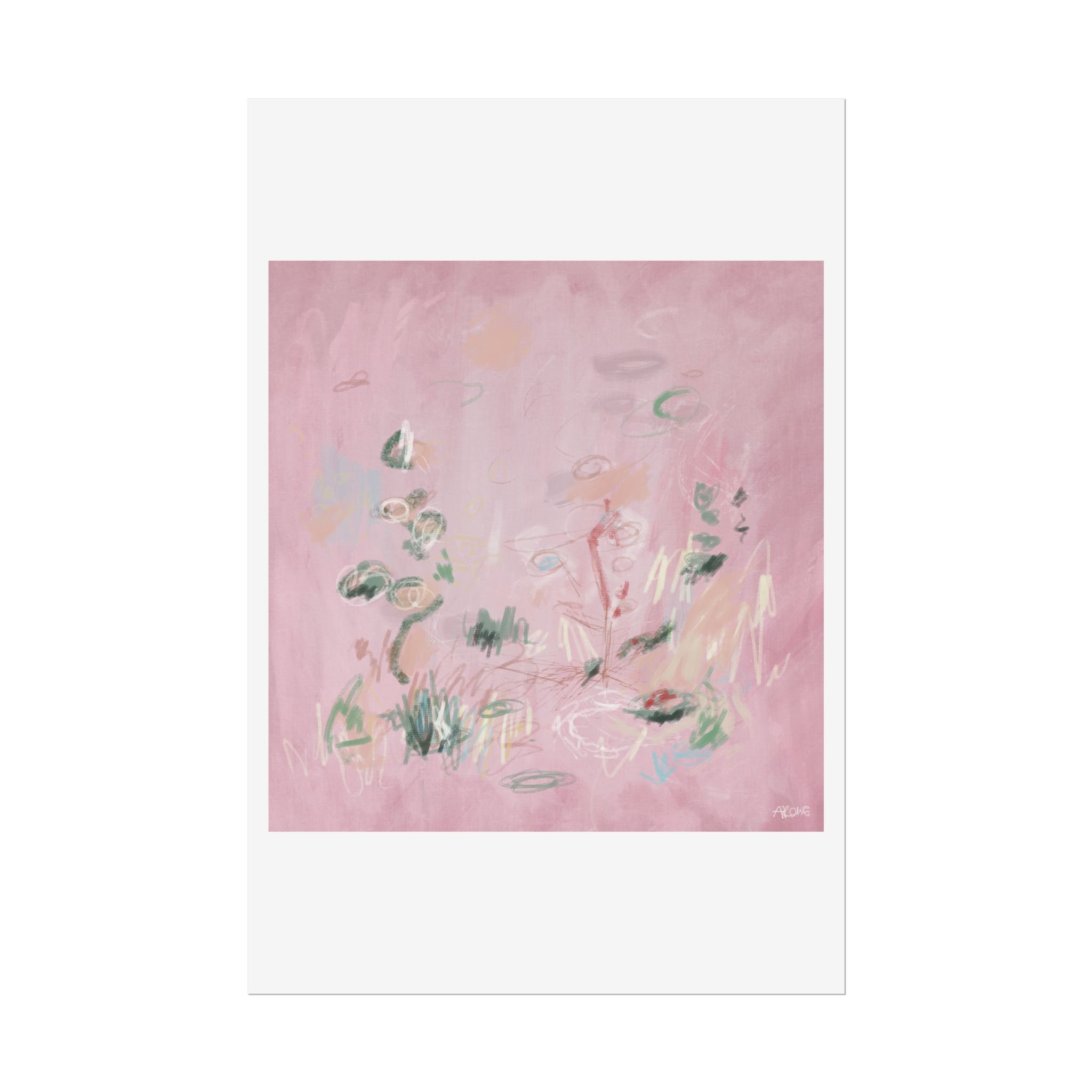 Soft, dreamy abstract blooms float across a wash of rosy pink in this rolled poster. The composition reads like a quiet daydream—whispers of green leaves and pale strokes that suggest movement, light, and gentle growth. Choose from textured fine art, matte, or semi-glossy paper to match the mood: fine art adds painterly depth and archival quality, matte keeps things understated and modern, and semi-glossy gives brighter color and crisp detail. Hung in a reading nook, layered in a gallery wall, or tucked into a frame, this poster brings a calming, intimate energy to spaces that favor subtle color and thoughtful texture.