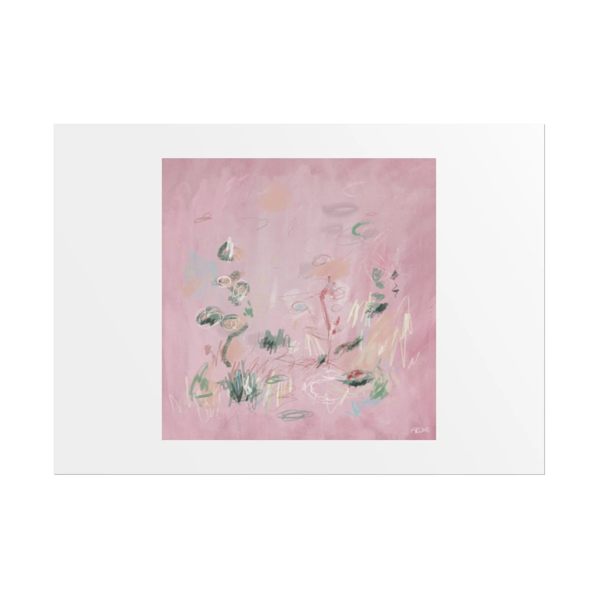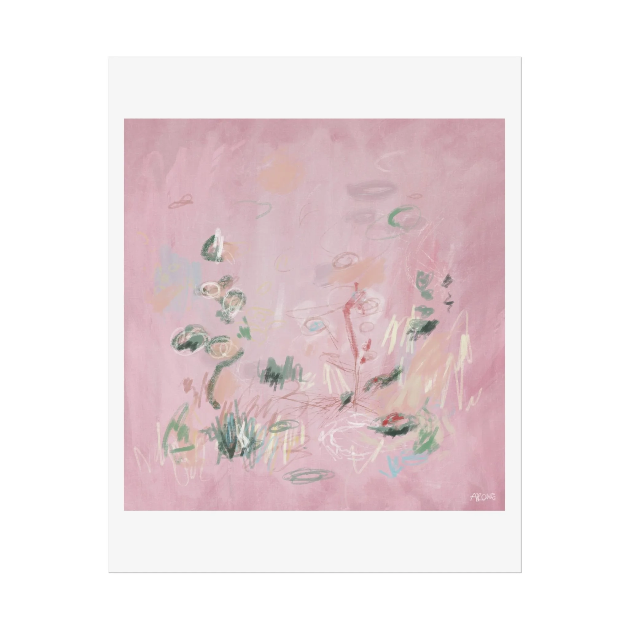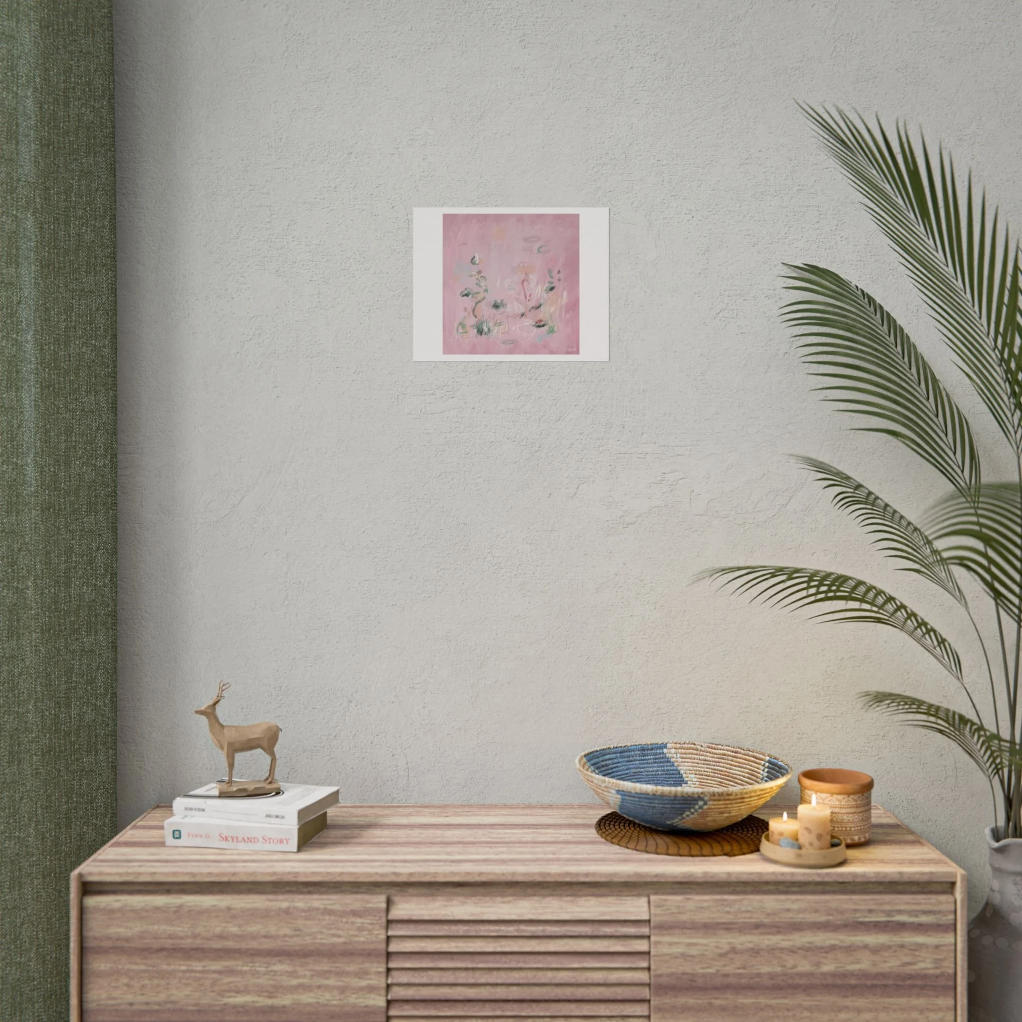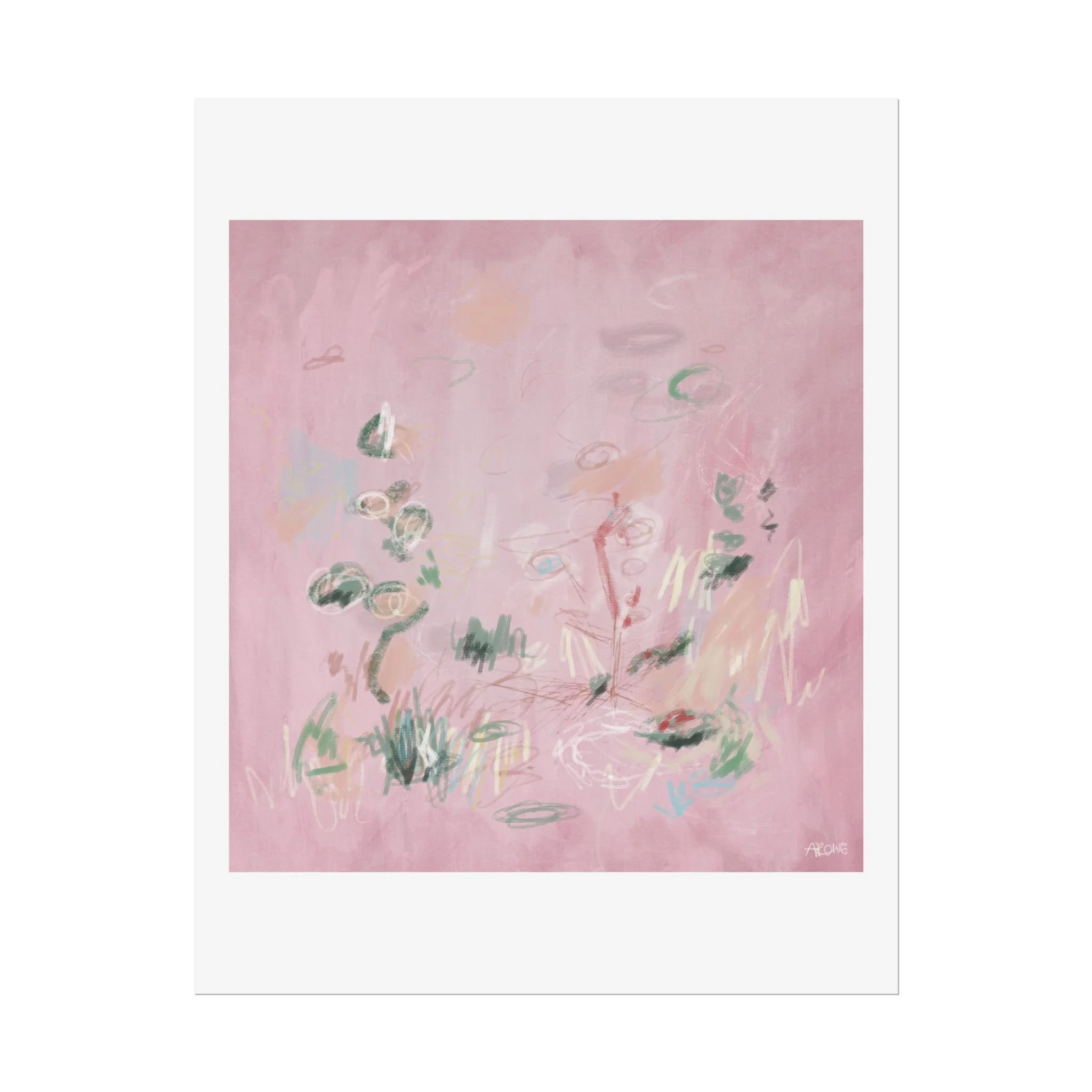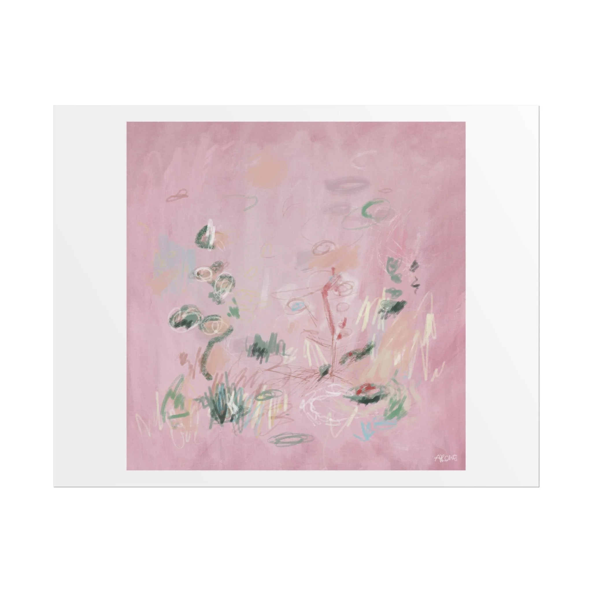 Soft, dreamy abstract blooms float across a wash of rosy pink in this rolled poster. The composition reads like a quiet daydream—whispers of green leaves and pale strokes that suggest movement, light, and gentle growth. Choose from textured fine art, matte, or semi-glossy paper to match the mood: fine art adds painterly depth and archival quality, matte keeps things understated and modern, and semi-glossy gives brighter color and crisp detail. Hung in a reading nook, layered in a gallery wall, or tucked into a frame, this poster brings a calming, intimate energy to spaces that favor subtle color and thoughtful texture.