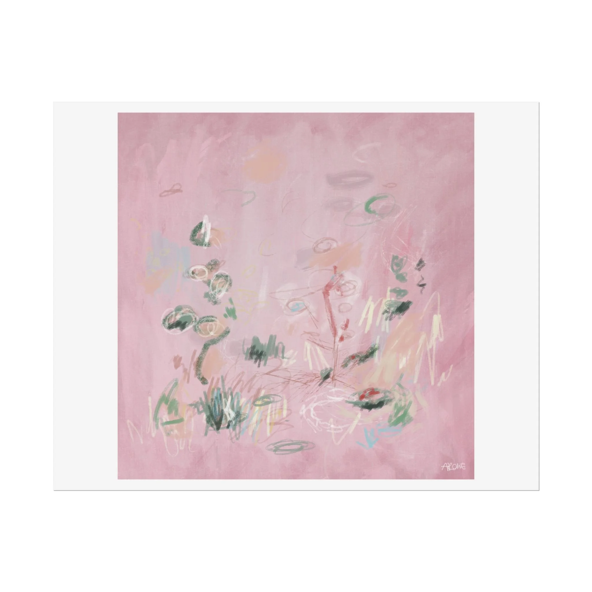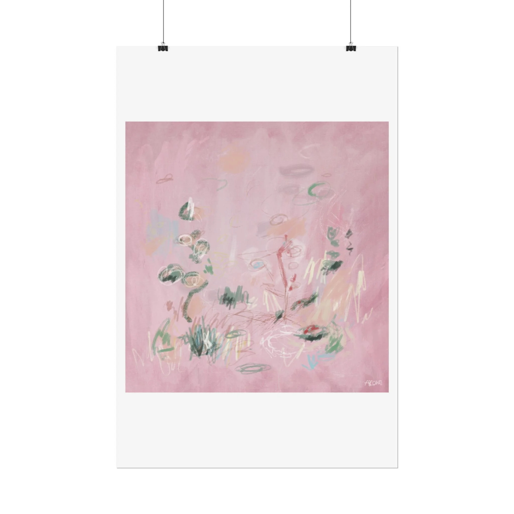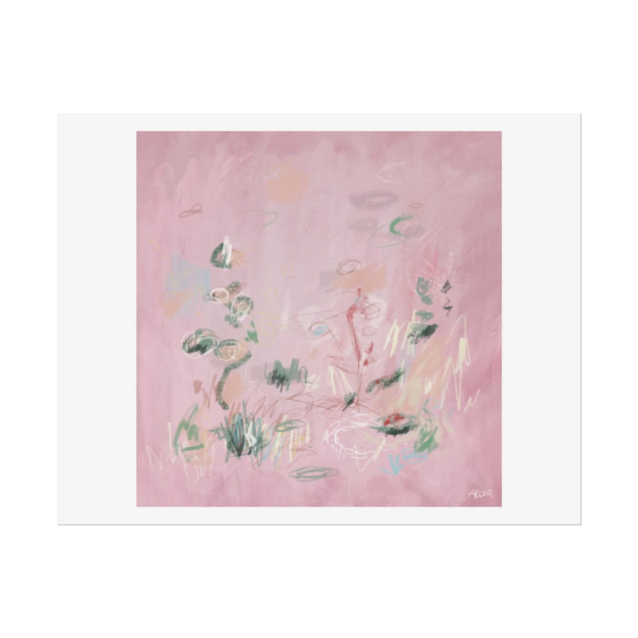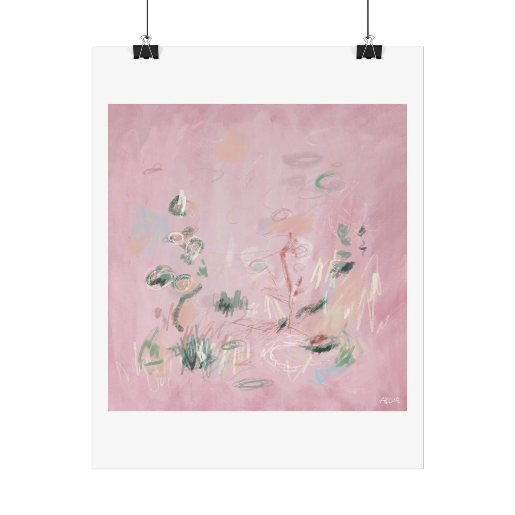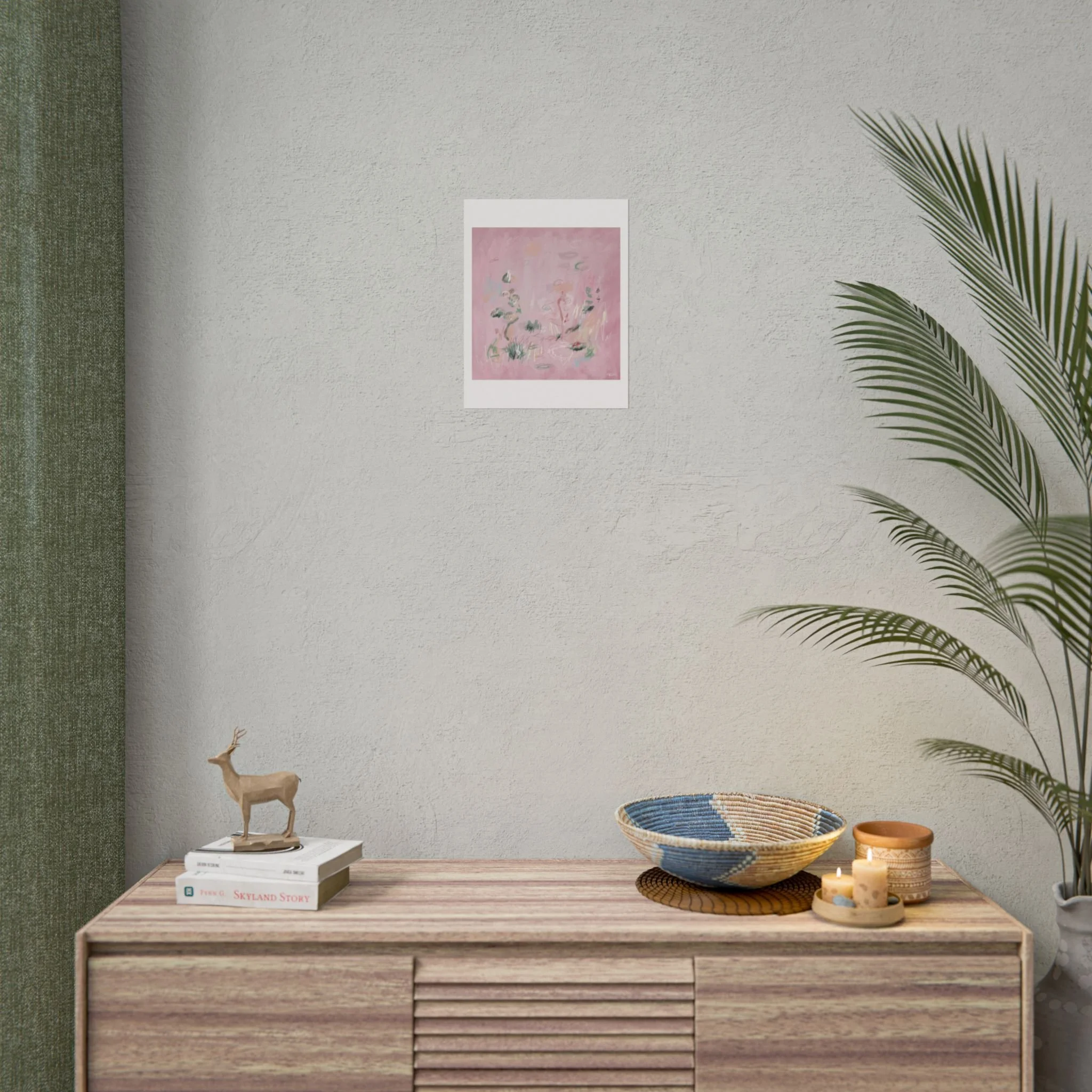 Soft, dreamy abstract blooms float across a wash of rosy pink in this rolled poster. The composition reads like a quiet daydream—whispers of green leaves and pale strokes that suggest movement, light, and gentle growth. Choose from textured fine art, matte, or semi-glossy paper to match the mood: fine art adds painterly depth and archival quality, matte keeps things understated and modern, and semi-glossy gives brighter color and crisp detail. Hung in a reading nook, layered in a gallery wall, or tucked into a frame, this poster brings a calming, intimate energy to spaces that favor subtle color and thoughtful texture.