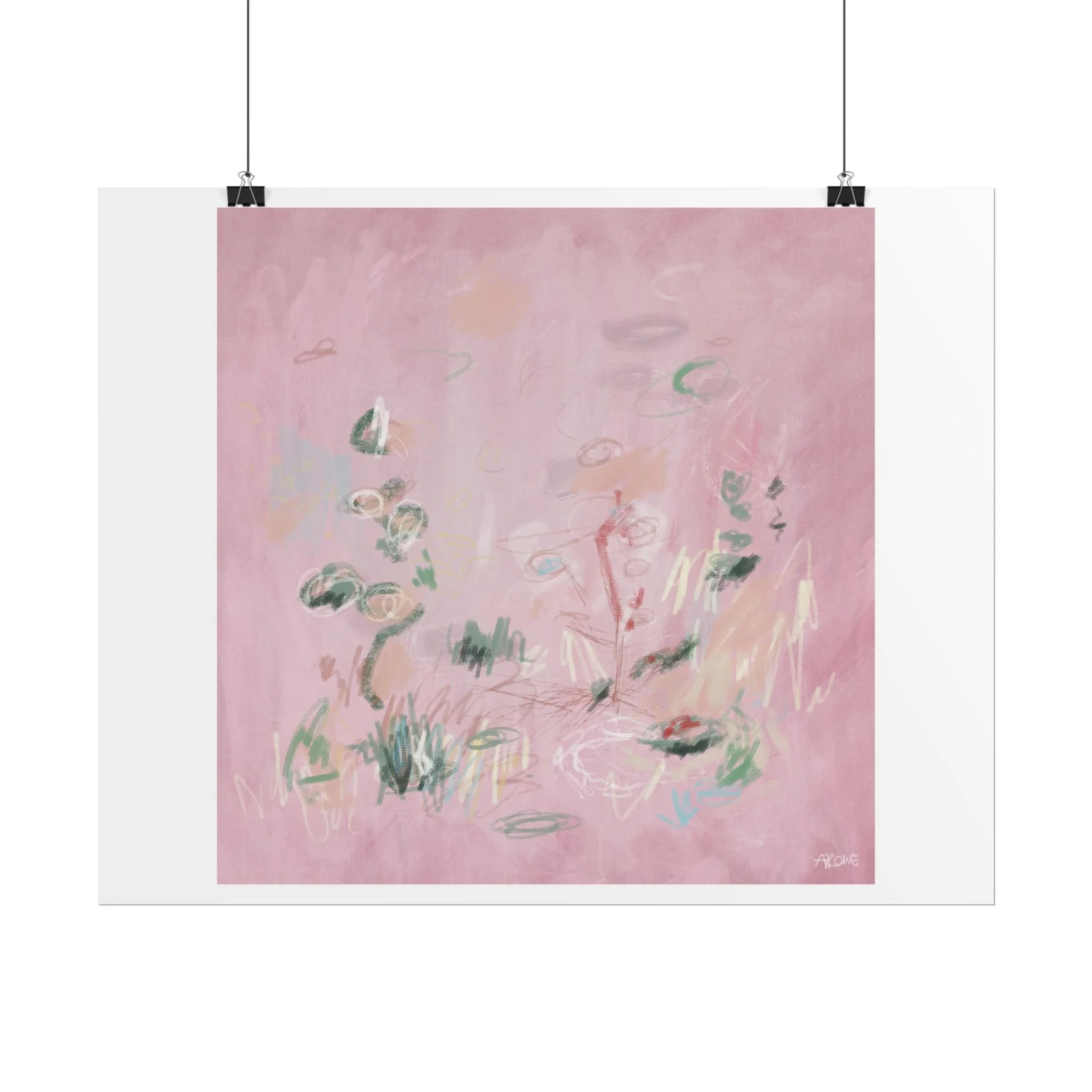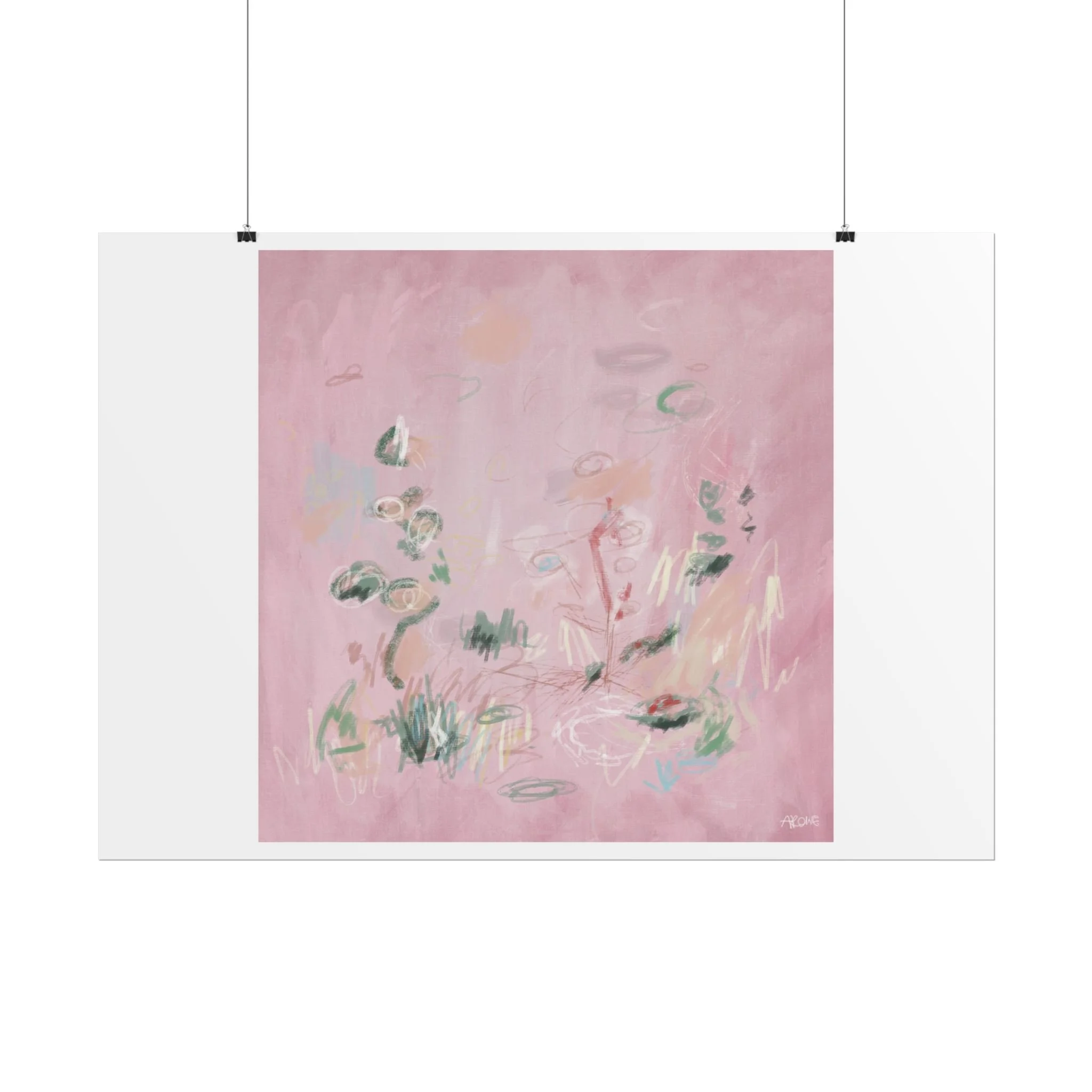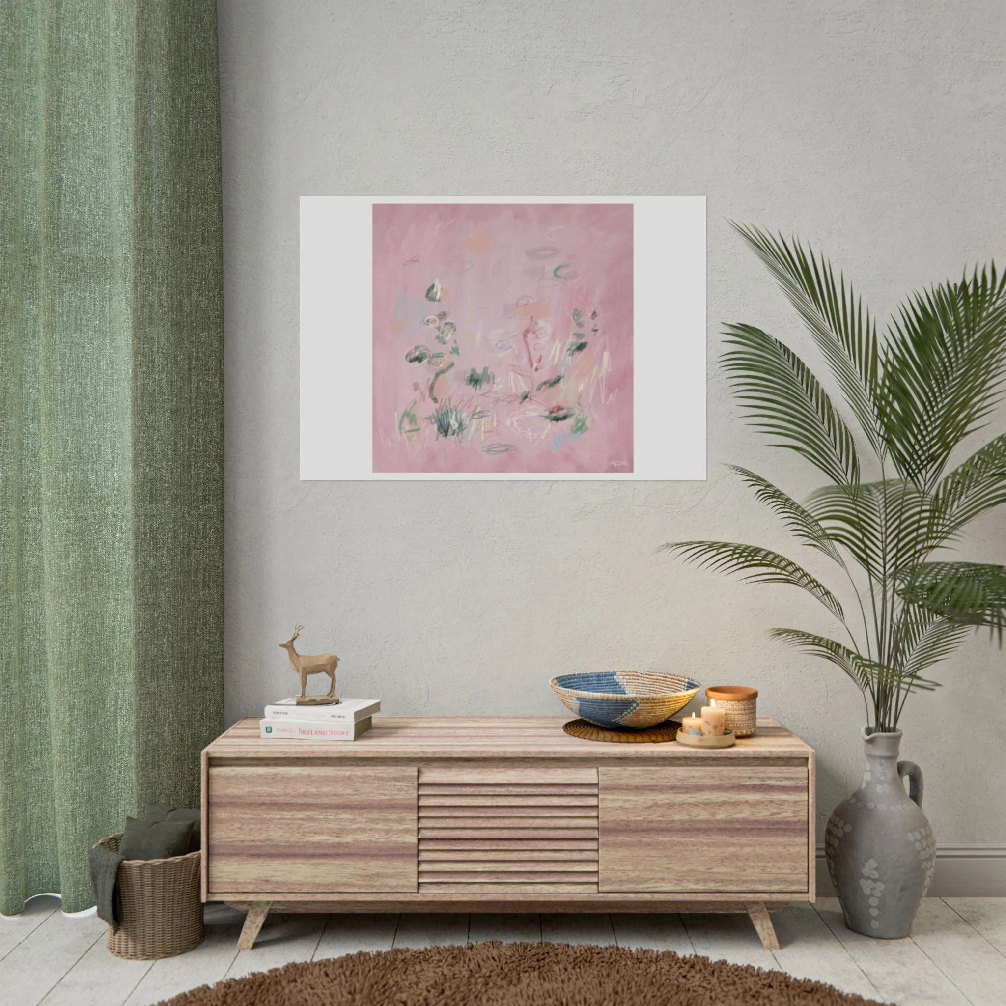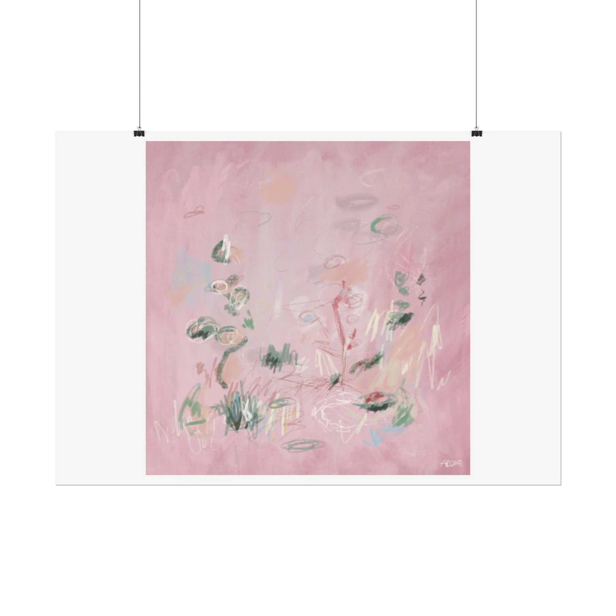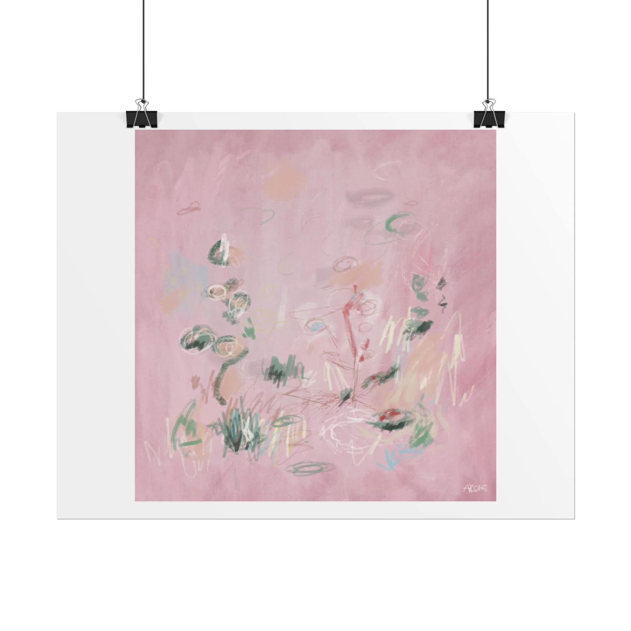 Soft, dreamy abstract blooms float across a wash of rosy pink in this rolled poster. The composition reads like a quiet daydream—whispers of green leaves and pale strokes that suggest movement, light, and gentle growth. Choose from textured fine art, matte, or semi-glossy paper to match the mood: fine art adds painterly depth and archival quality, matte keeps things understated and modern, and semi-glossy gives brighter color and crisp detail. Hung in a reading nook, layered in a gallery wall, or tucked into a frame, this poster brings a calming, intimate energy to spaces that favor subtle color and thoughtful texture.
