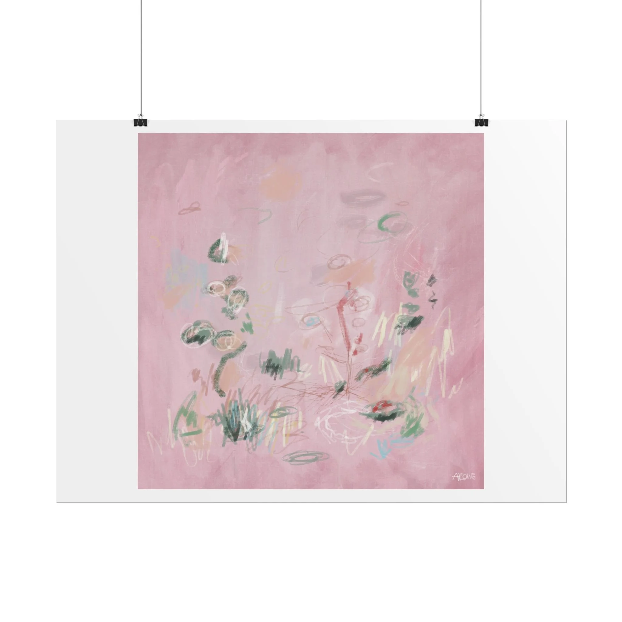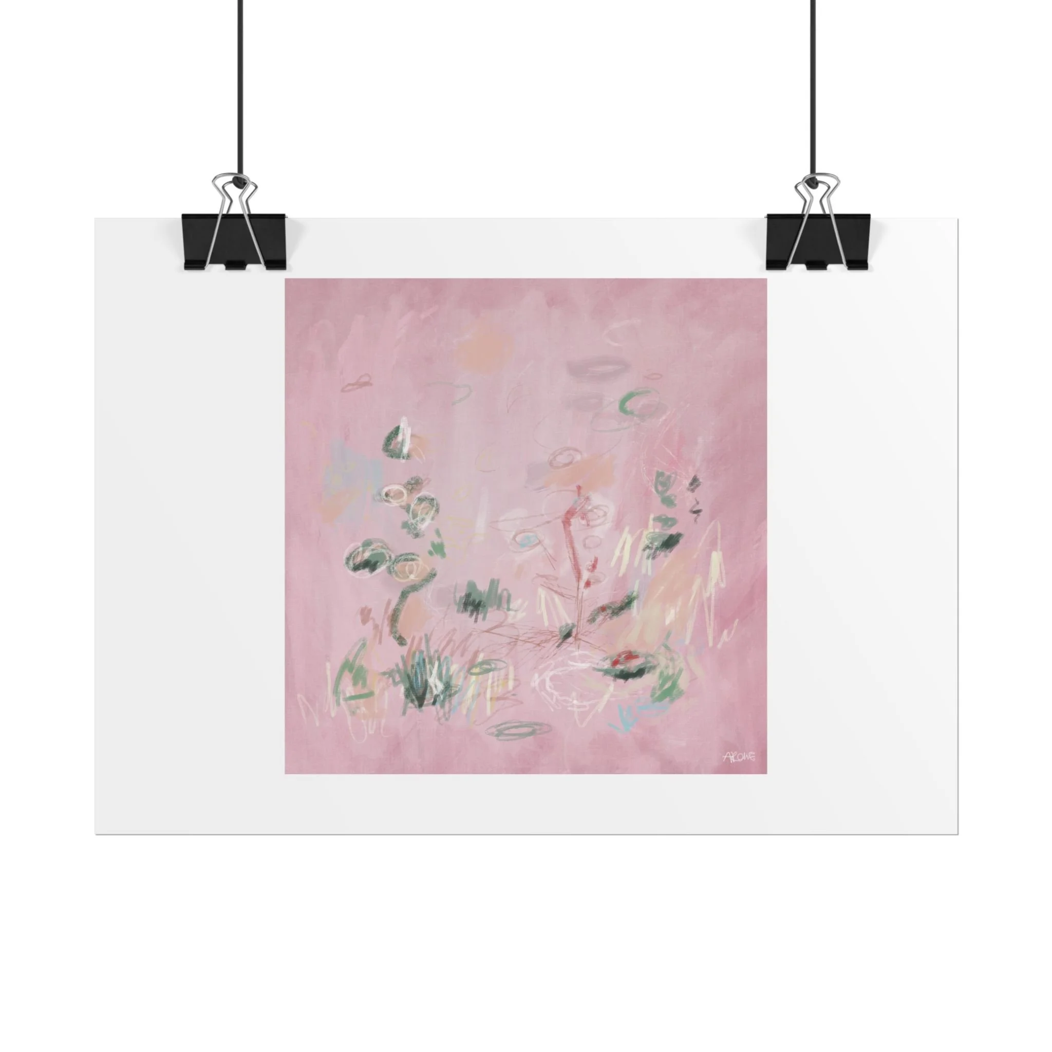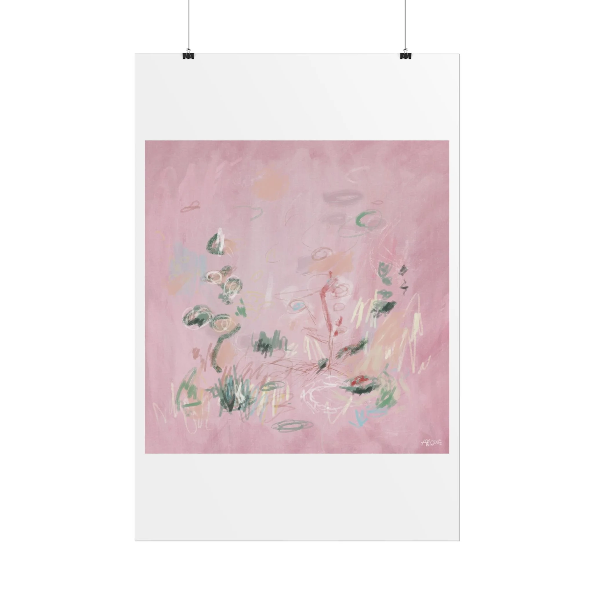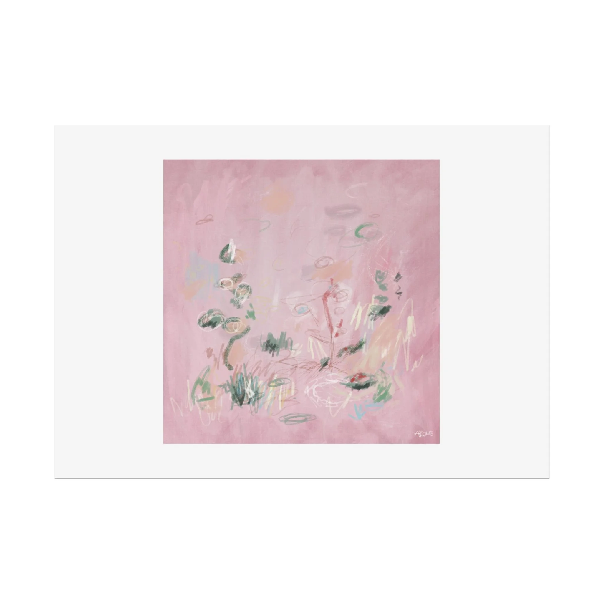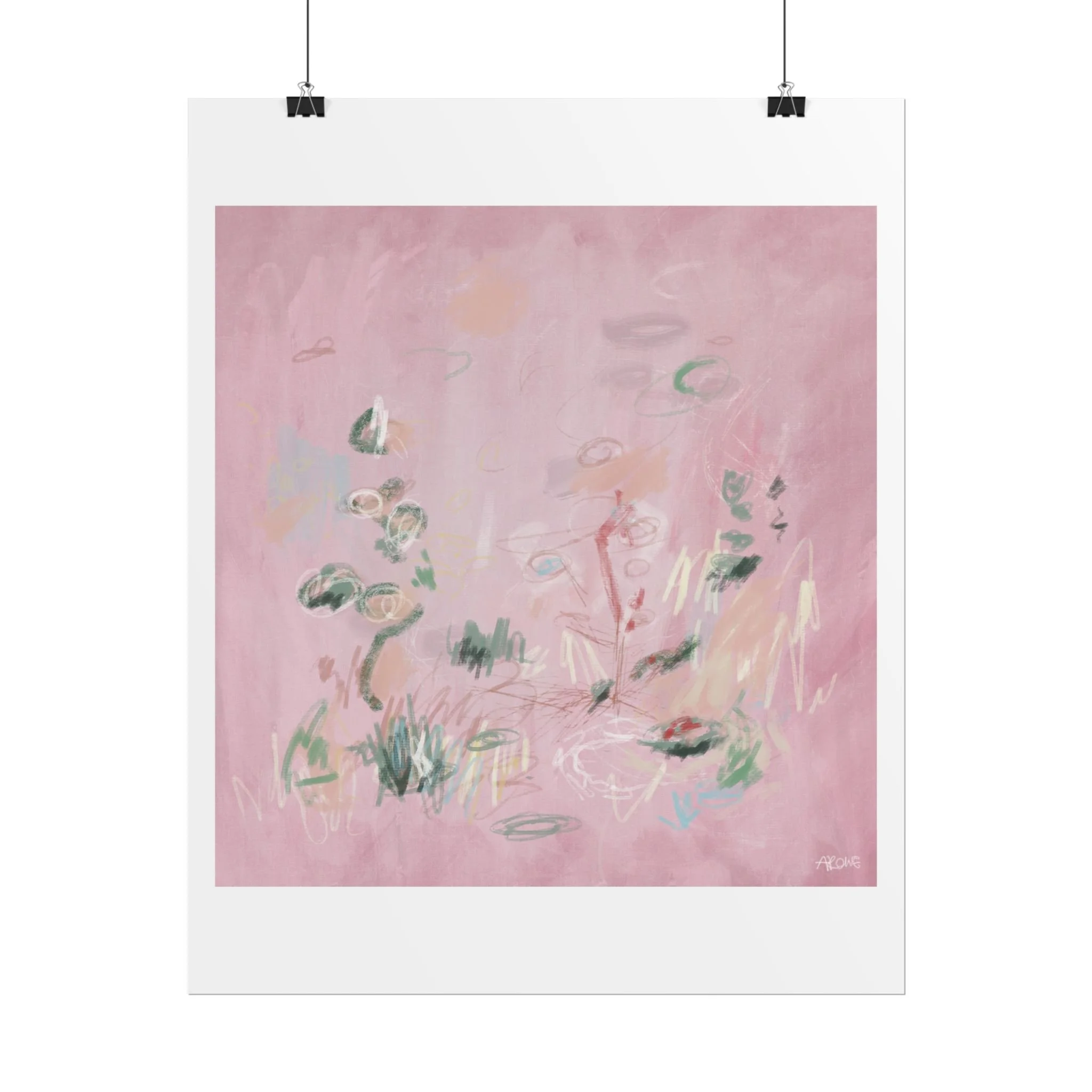 Soft, dreamy abstract blooms float across a wash of rosy pink in this rolled poster. The composition reads like a quiet daydream—whispers of green leaves and pale strokes that suggest movement, light, and gentle growth. Choose from textured fine art, matte, or semi-glossy paper to match the mood: fine art adds painterly depth and archival quality, matte keeps things understated and modern, and semi-glossy gives brighter color and crisp detail. Hung in a reading nook, layered in a gallery wall, or tucked into a frame, this poster brings a calming, intimate energy to spaces that favor subtle color and thoughtful texture.