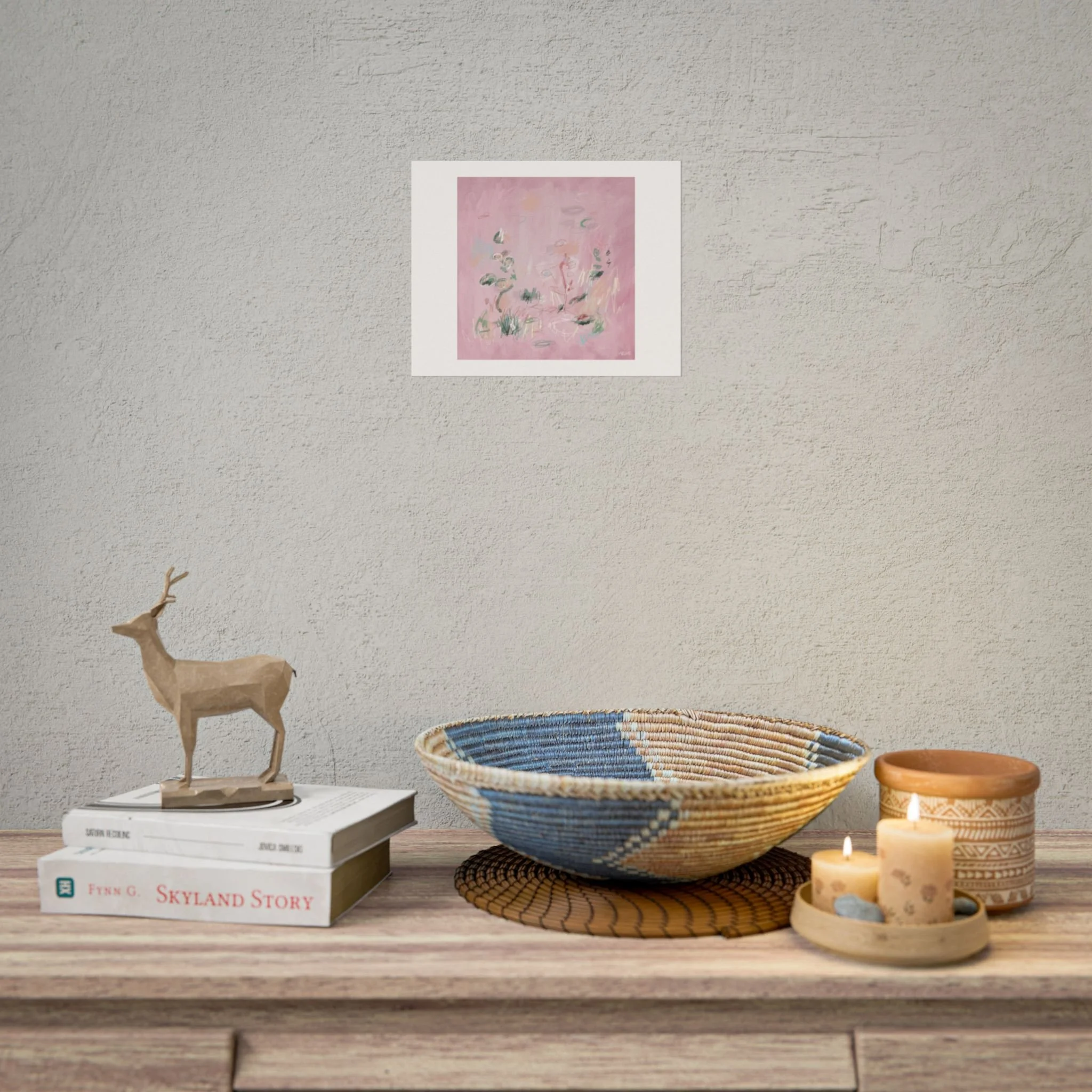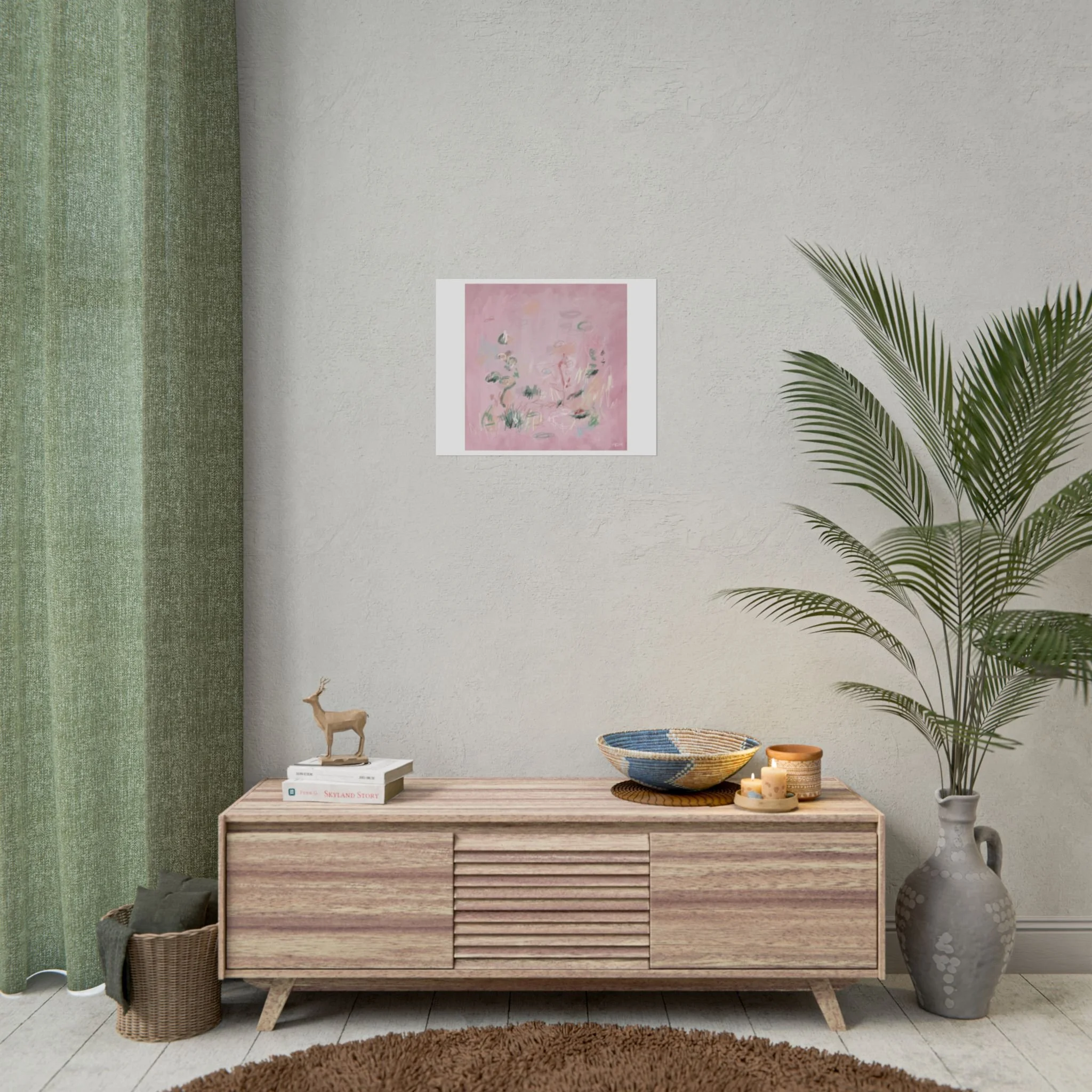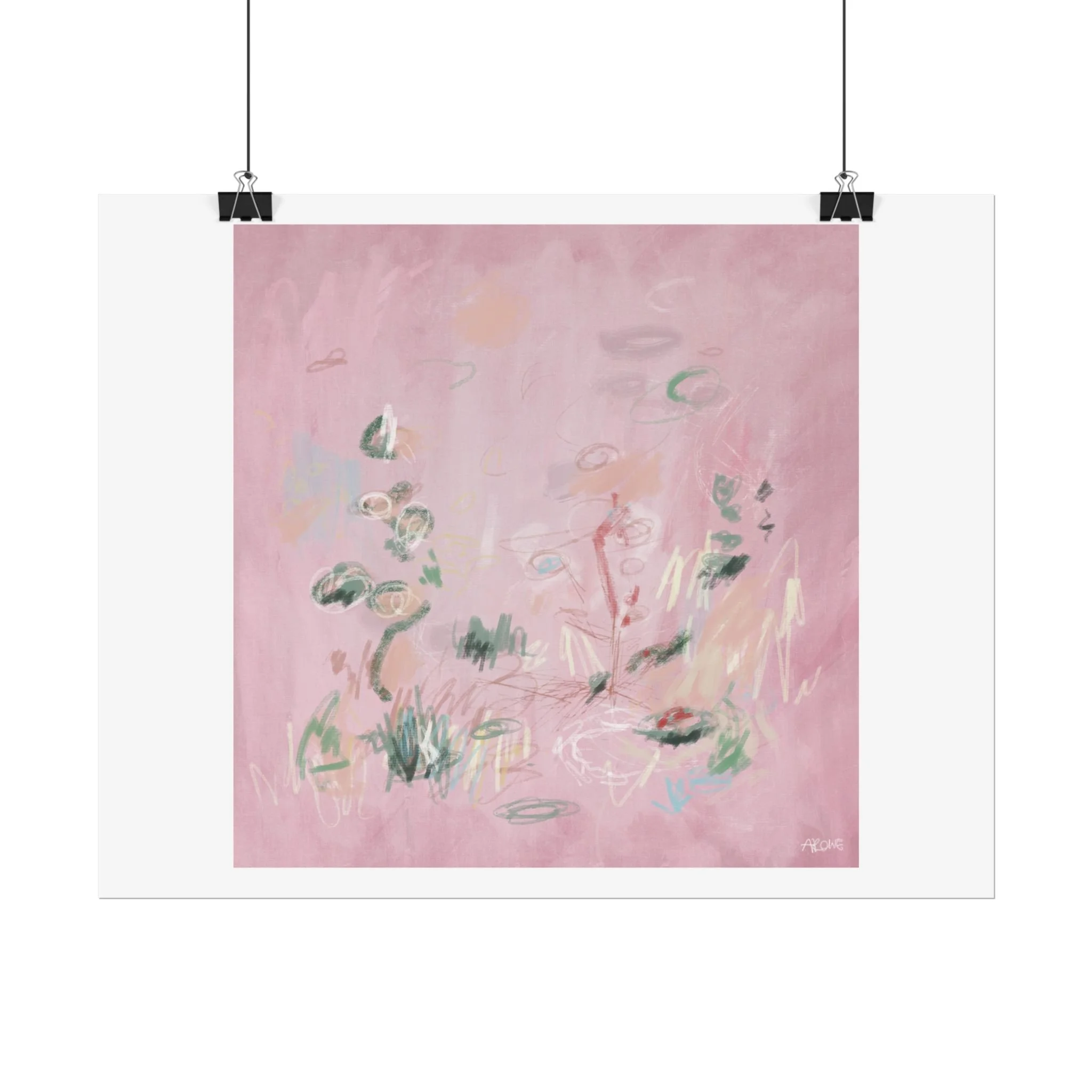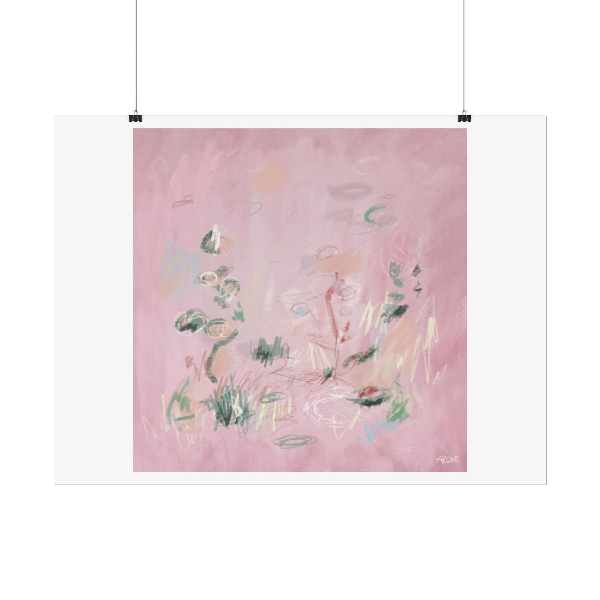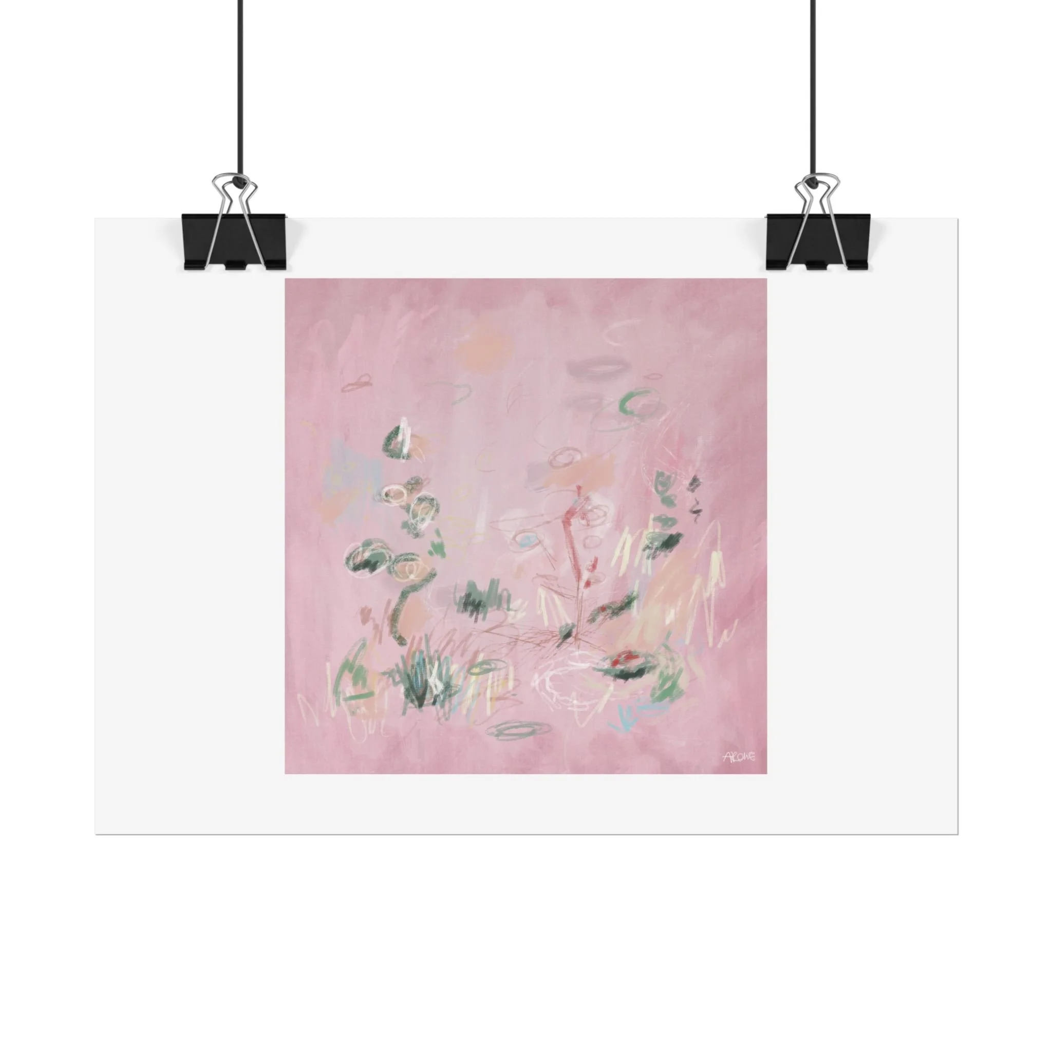 Soft, dreamy abstract blooms float across a wash of rosy pink in this rolled poster. The composition reads like a quiet daydream—whispers of green leaves and pale strokes that suggest movement, light, and gentle growth. Choose from textured fine art, matte, or semi-glossy paper to match the mood: fine art adds painterly depth and archival quality, matte keeps things understated and modern, and semi-glossy gives brighter color and crisp detail. Hung in a reading nook, layered in a gallery wall, or tucked into a frame, this poster brings a calming, intimate energy to spaces that favor subtle color and thoughtful texture.