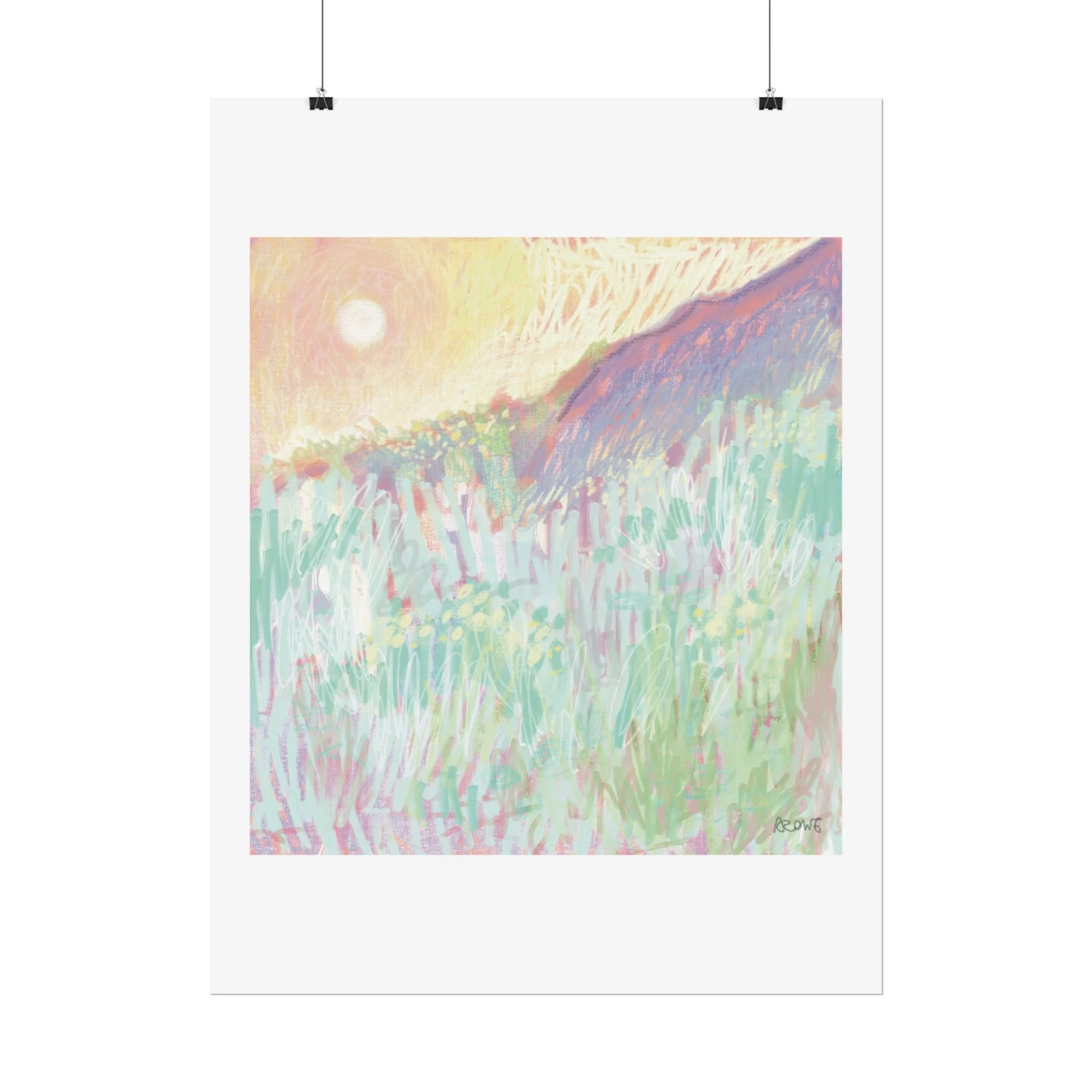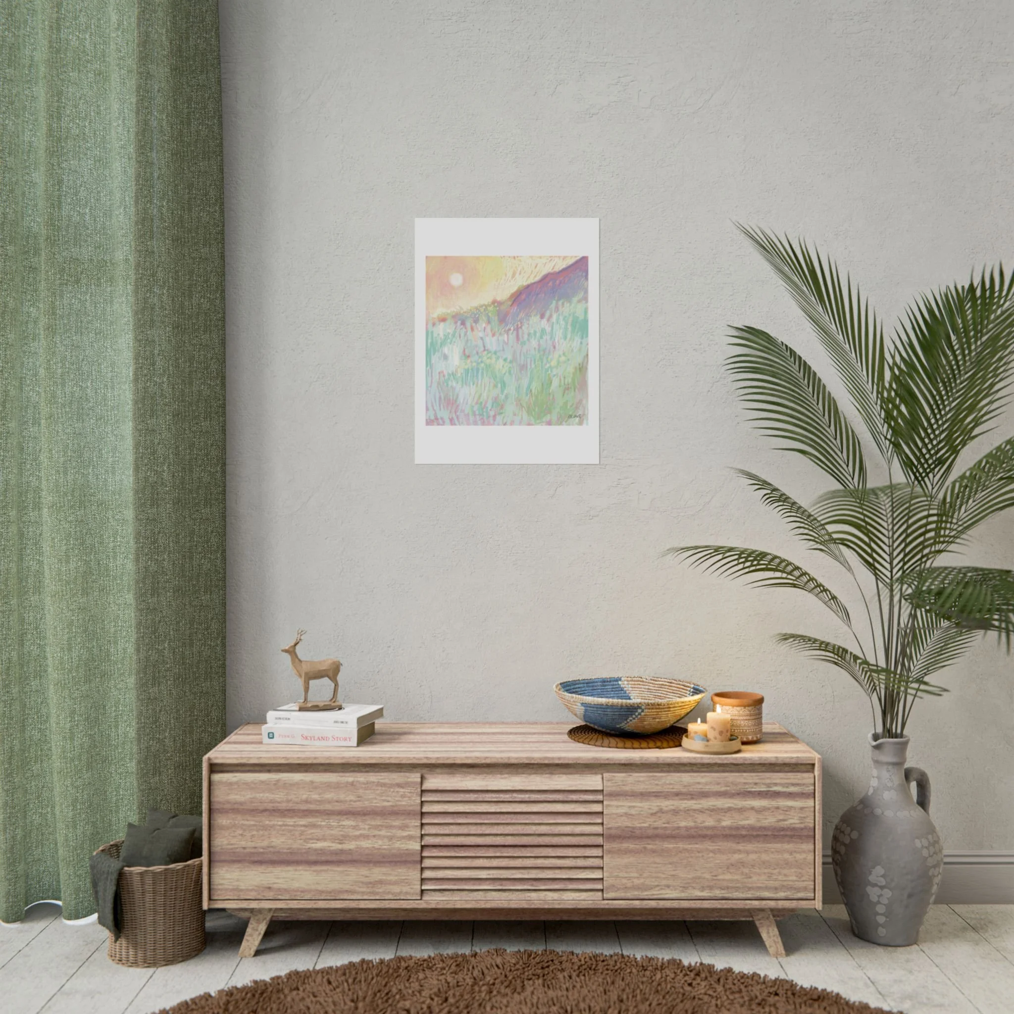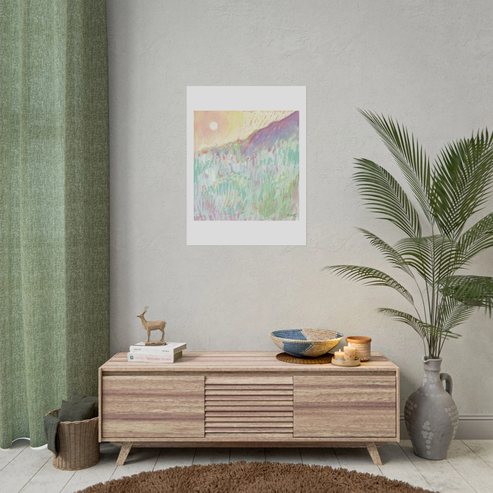 A soft, painterly poster that captures a pastel sunrise over a breezy meadow. Gentle strokes of mint, blush and lavender blend into a warm sunlit hill — the kind of image that calms a busy room and invites slow mornings. Rolled for safe shipping, this print brings a subtle, artful presence to a bedroom wall, reading nook, or studio without shouting for attention. It reads like a quiet memory: early light, tall grasses moving in a breeze, and the hush before the day fully begins.