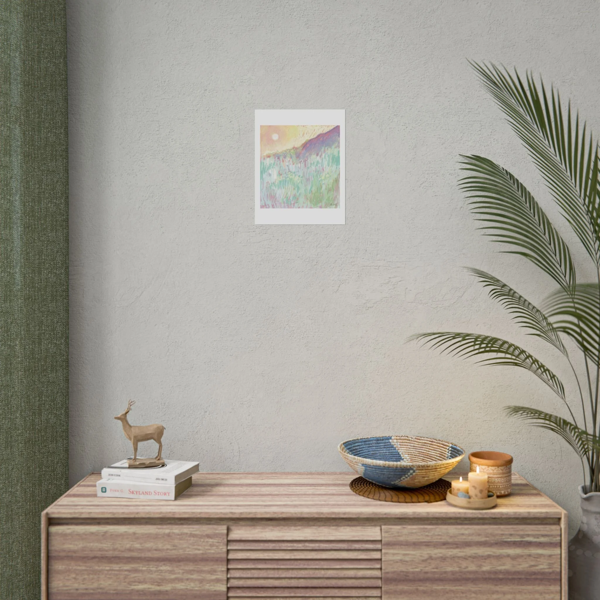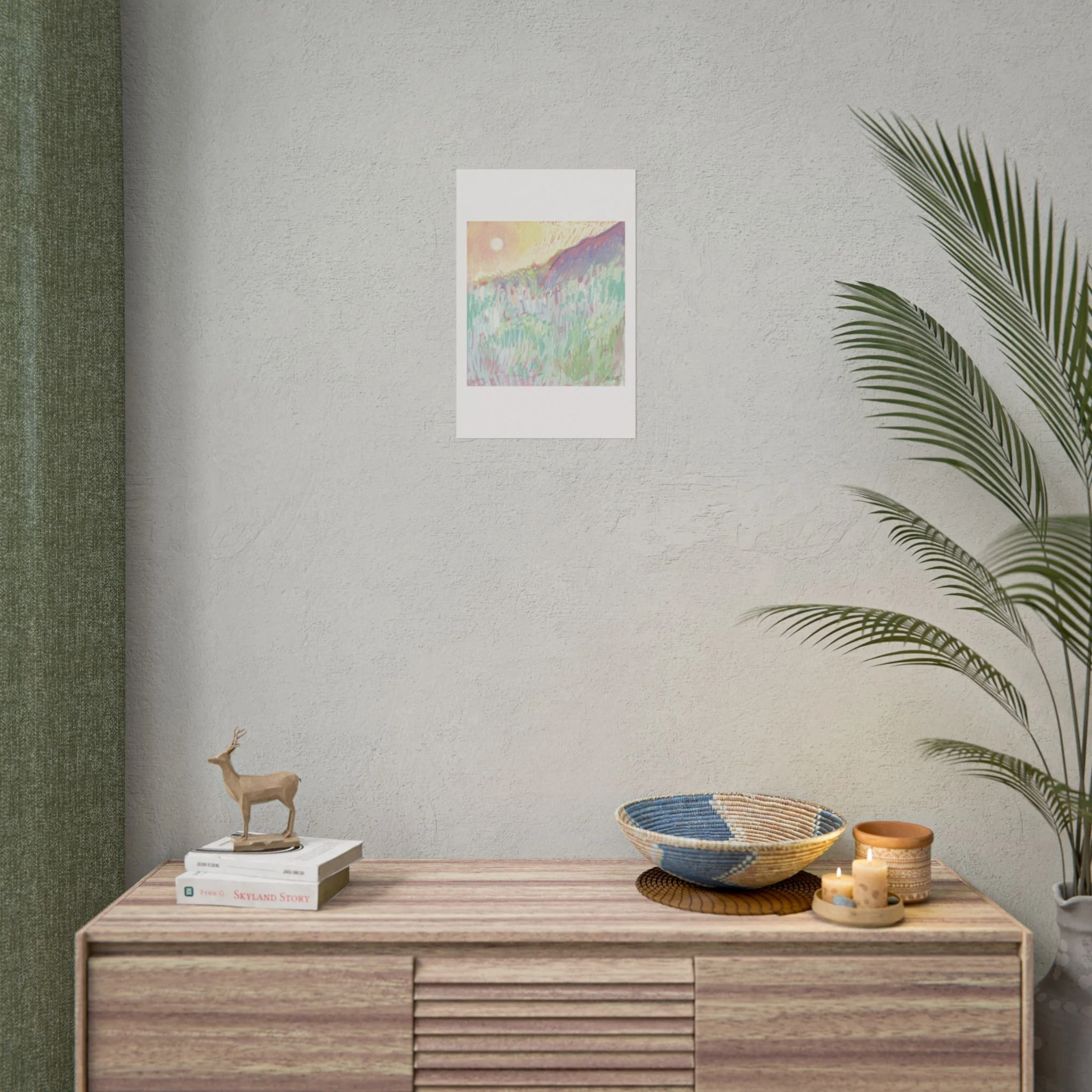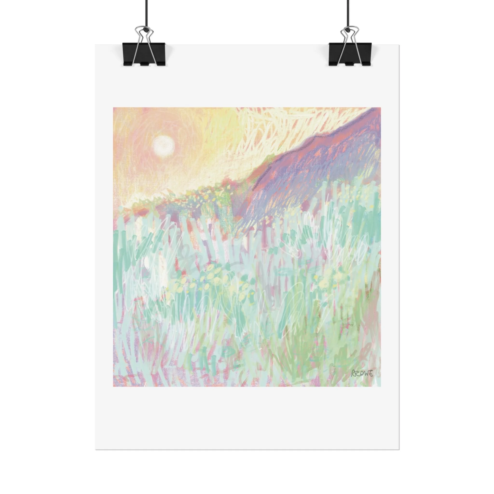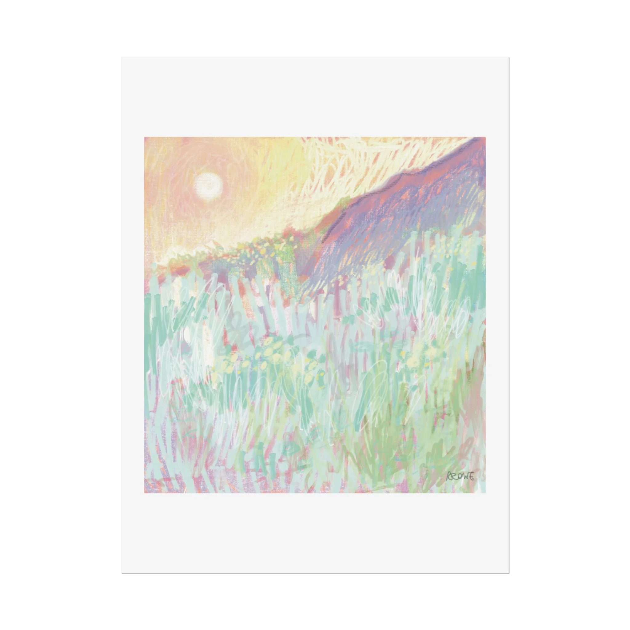 A soft, painterly poster that captures a pastel sunrise over a breezy meadow. Gentle strokes of mint, blush and lavender blend into a warm sunlit hill — the kind of image that calms a busy room and invites slow mornings. Rolled for safe shipping, this print brings a subtle, artful presence to a bedroom wall, reading nook, or studio without shouting for attention. It reads like a quiet memory: early light, tall grasses moving in a breeze, and the hush before the day fully begins.